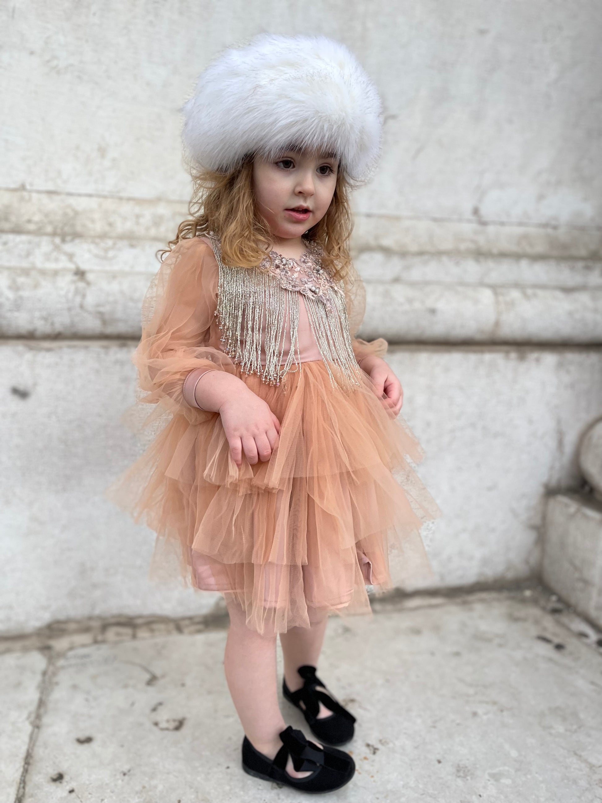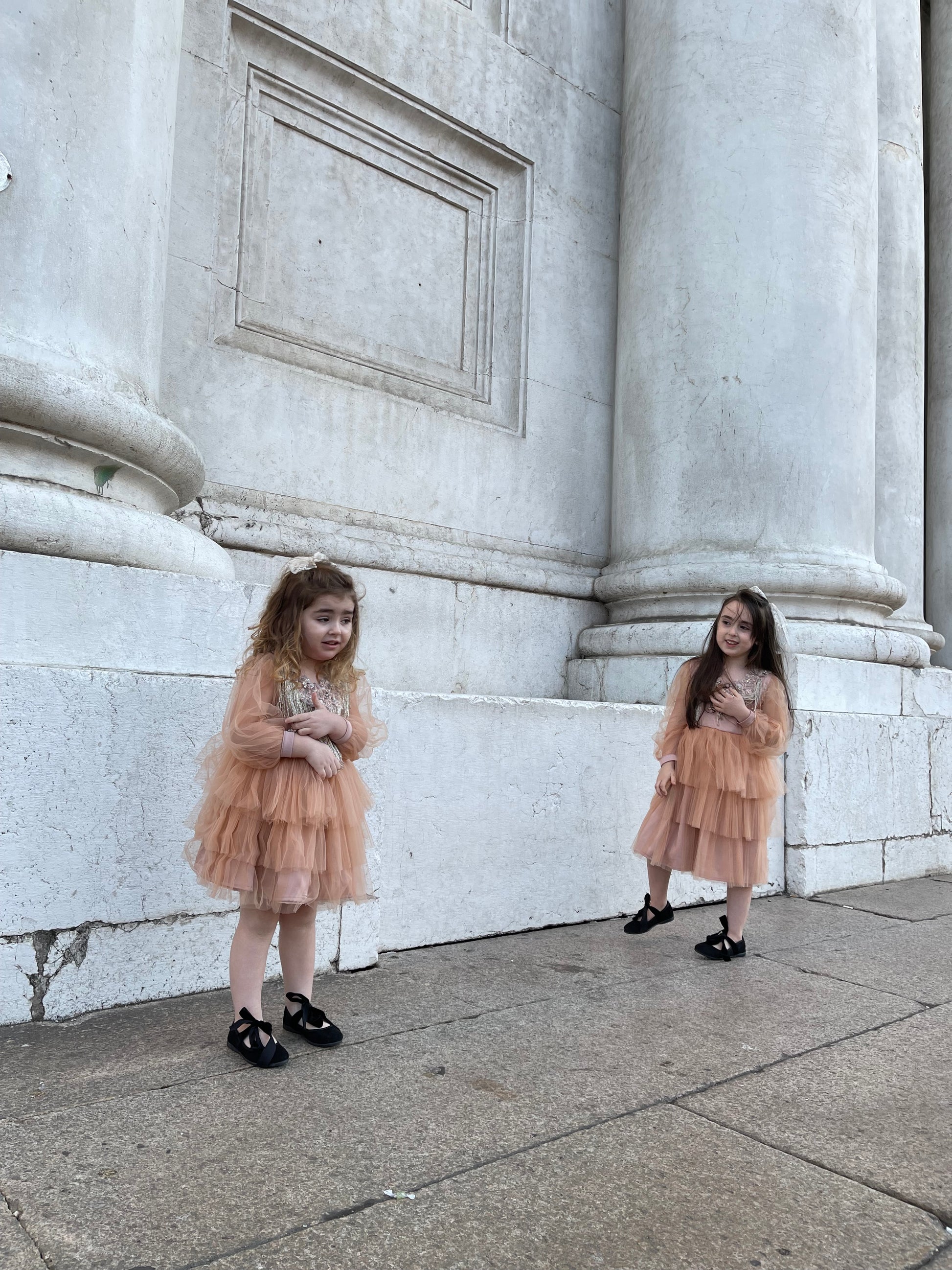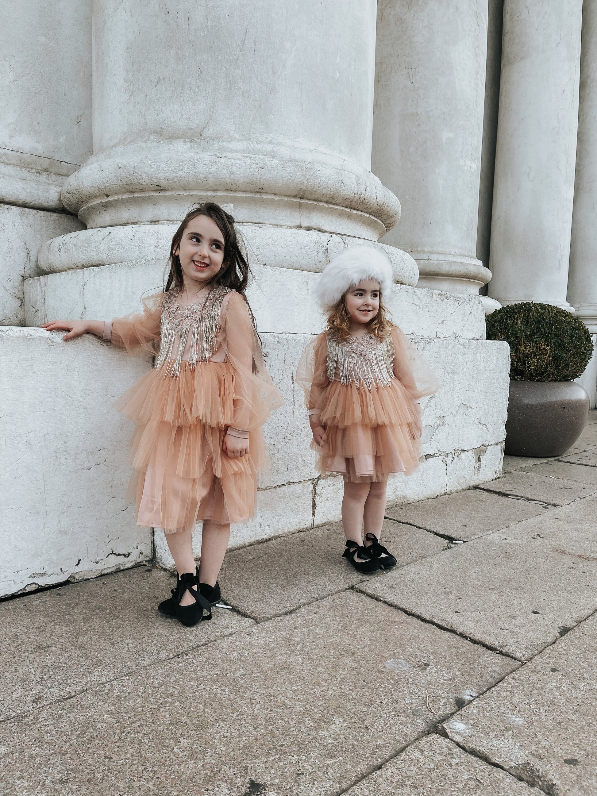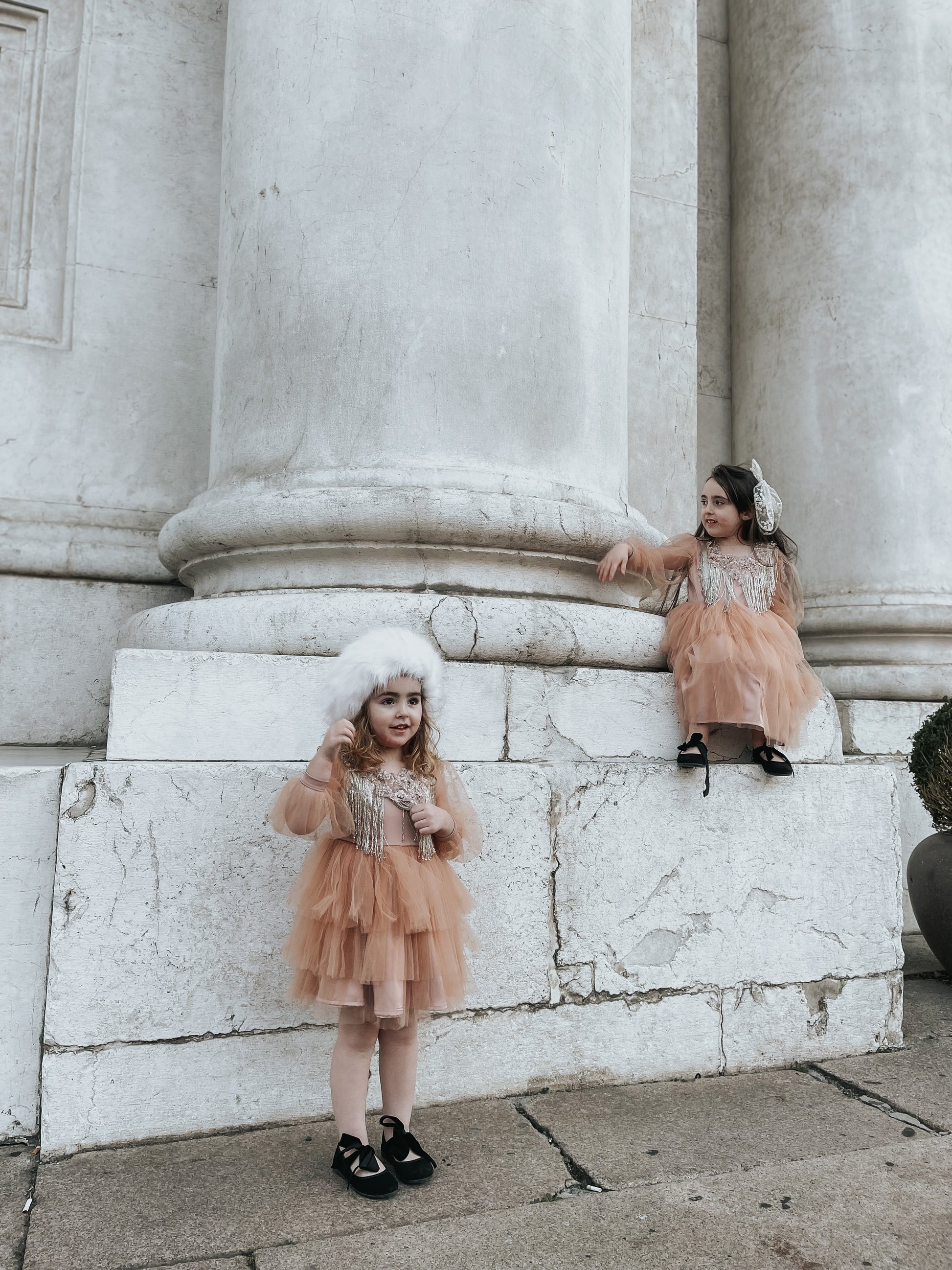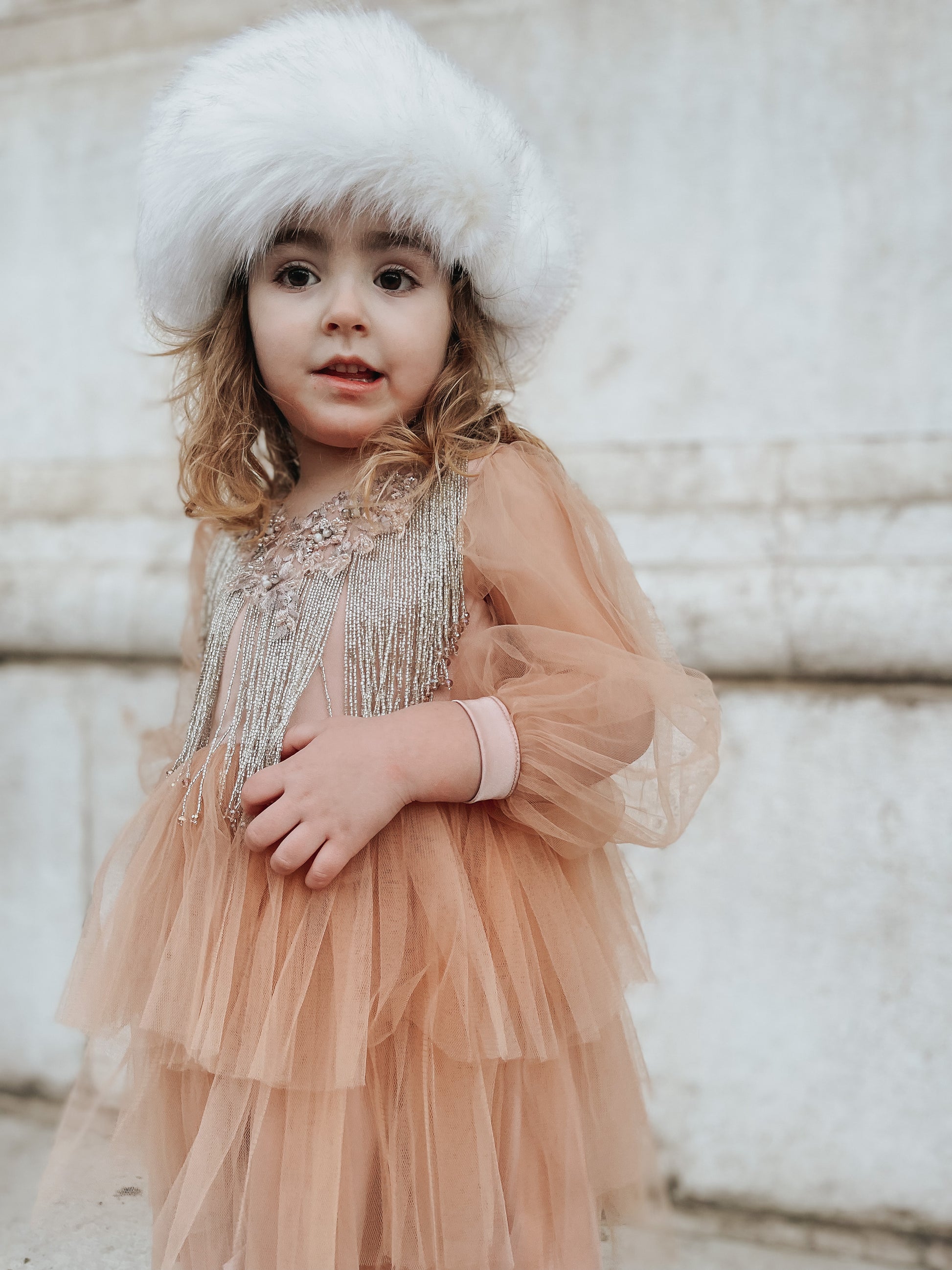 Garbi dress, fustan eventesh dhe pagezimi.Me menge te gjata transparente dhe detaje ruazash e kristalesh.