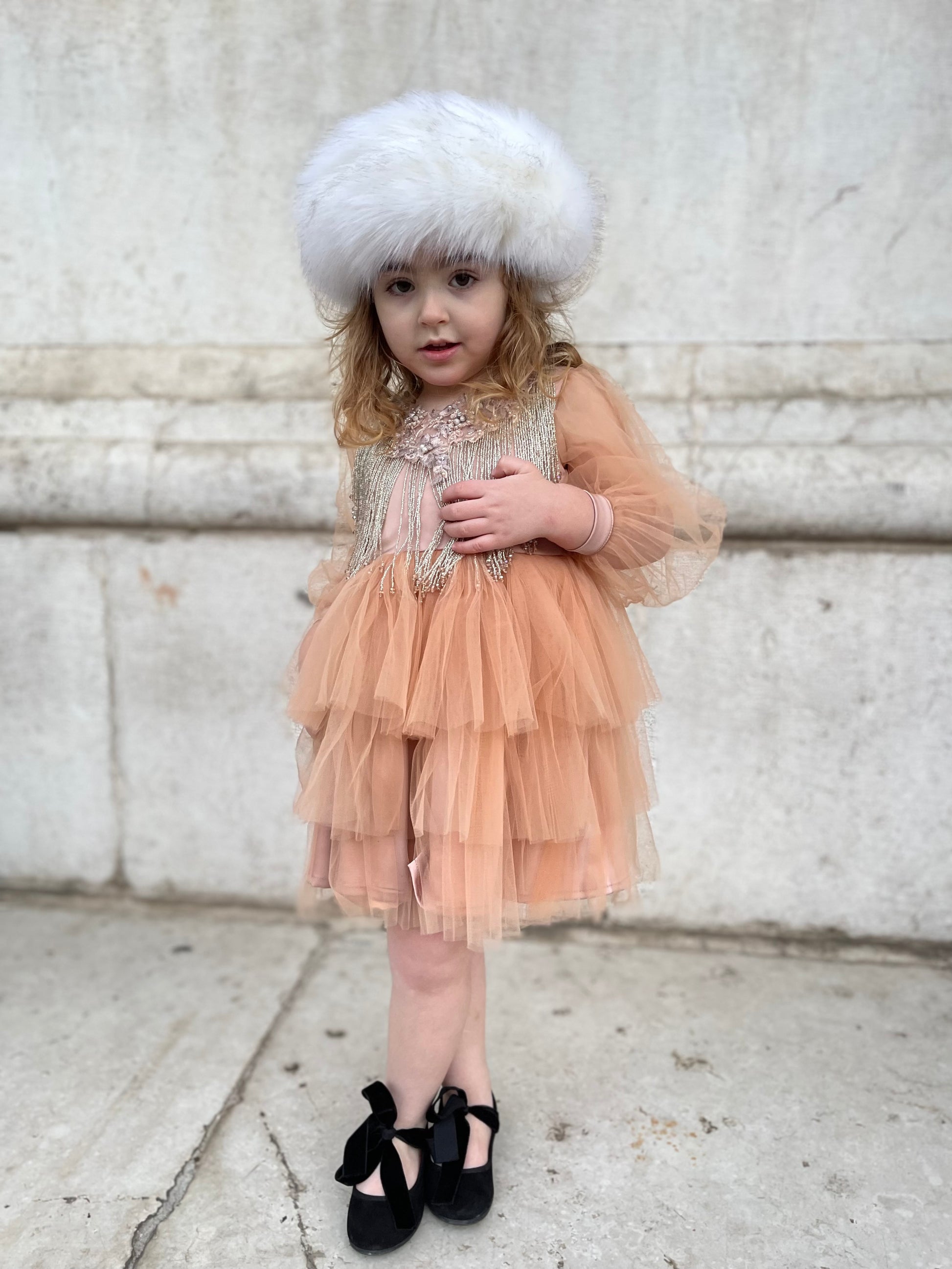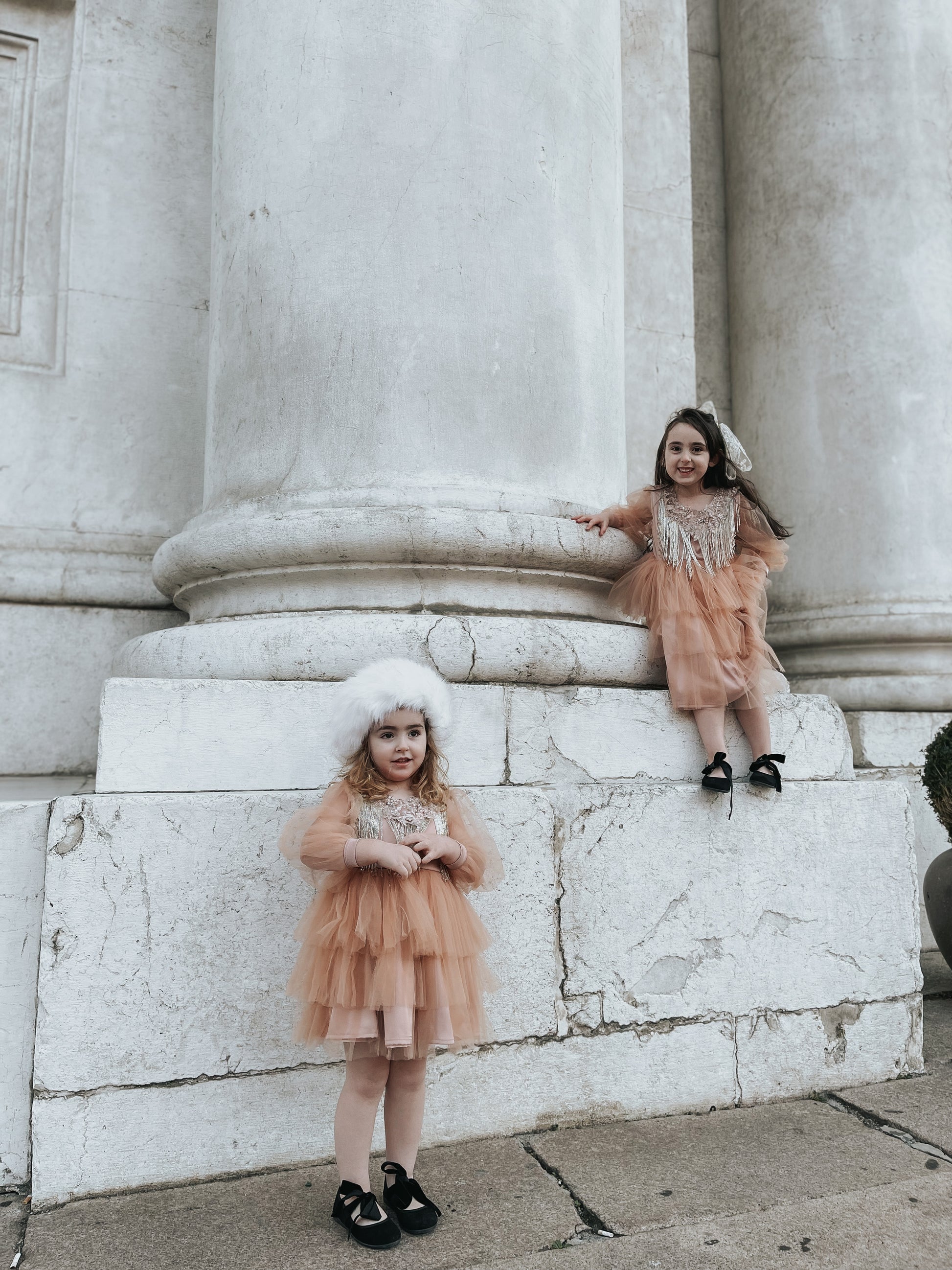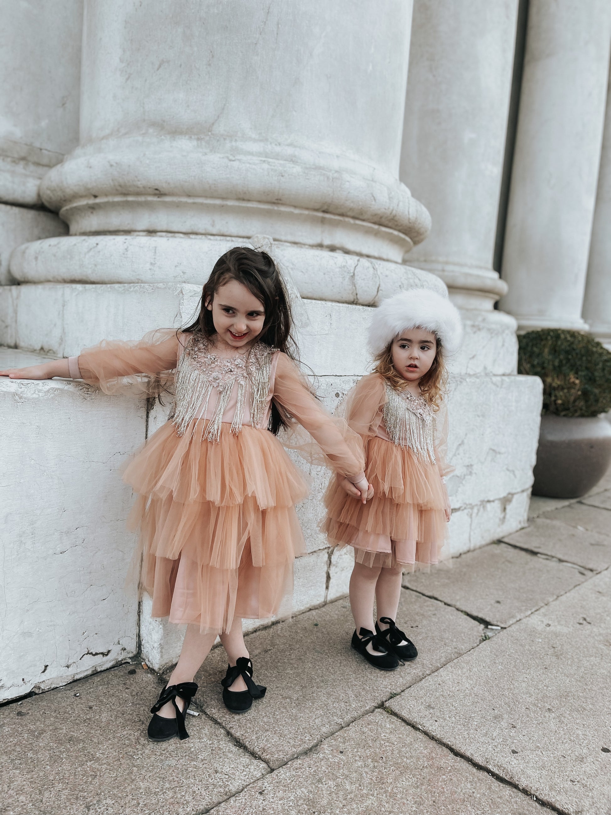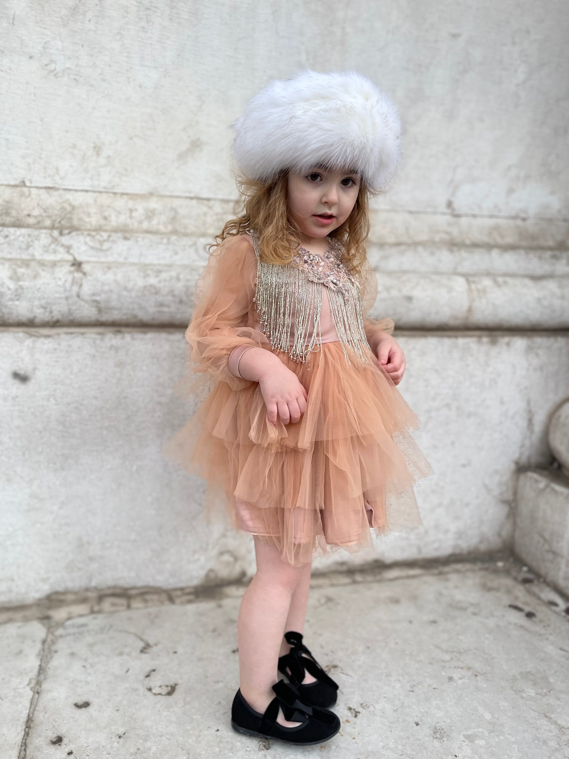 Garbi dress, fustan eventesh dhe pagezimi.Me menge te gjata transparente dhe detaje ruazash e kristalesh.