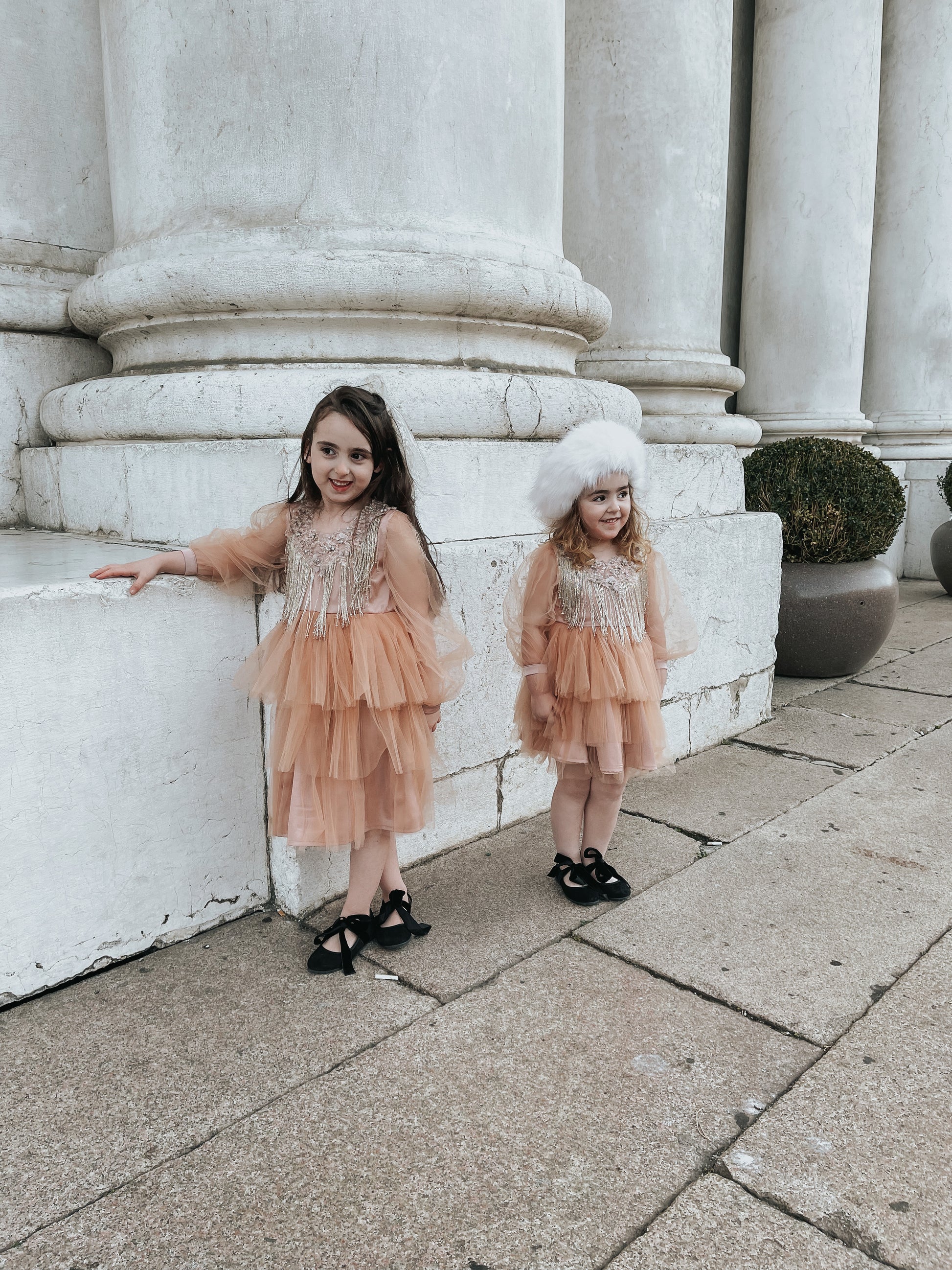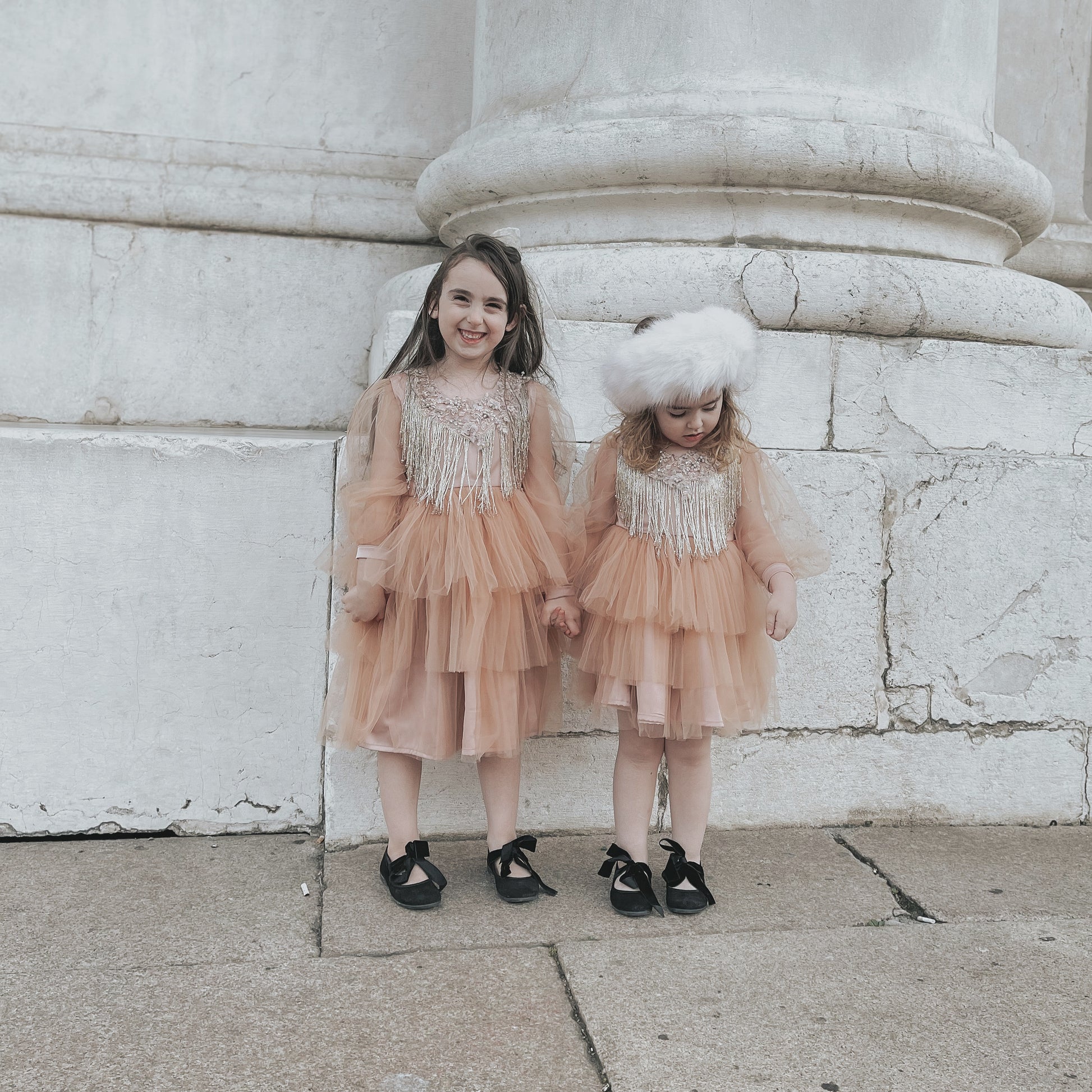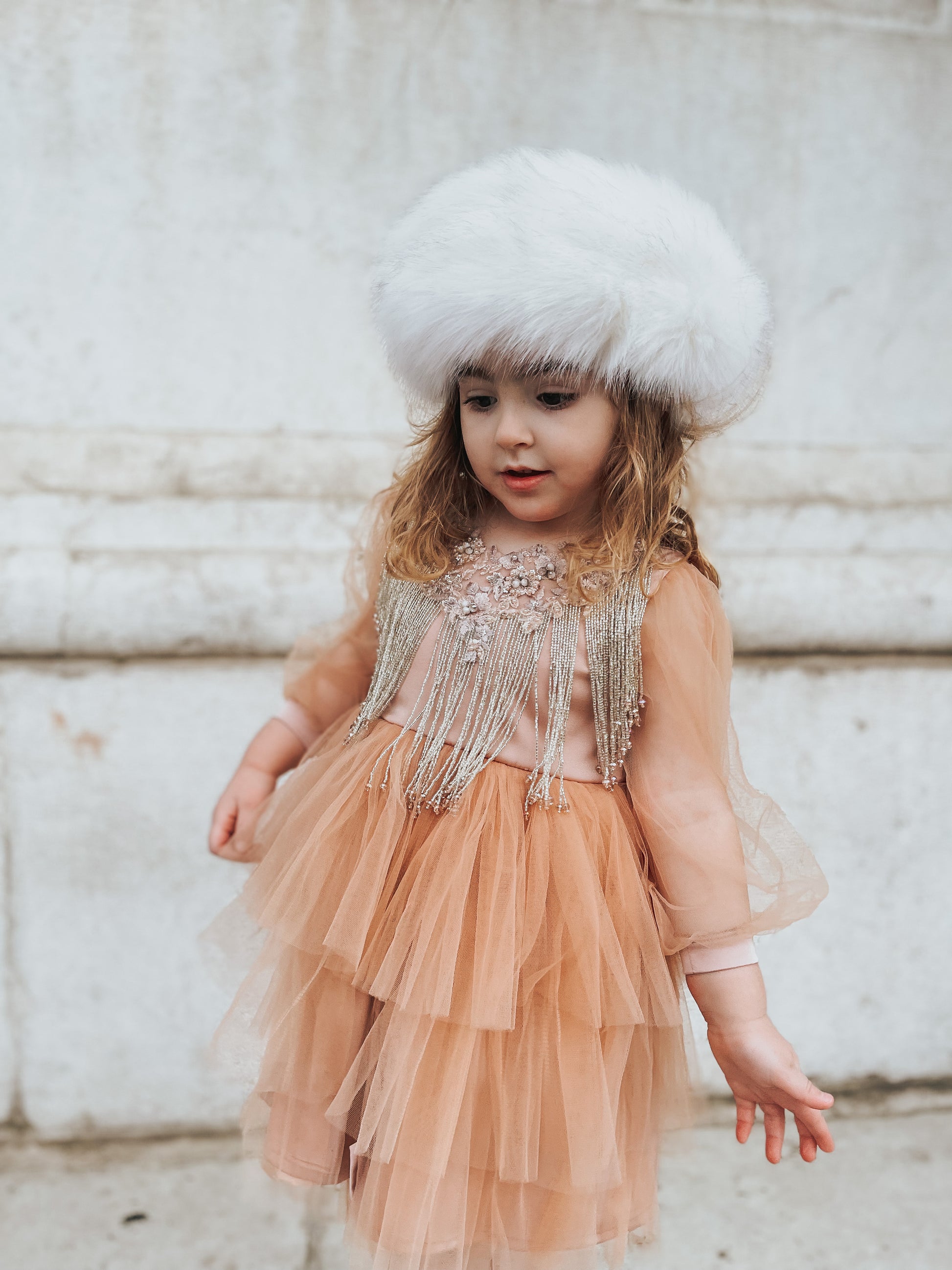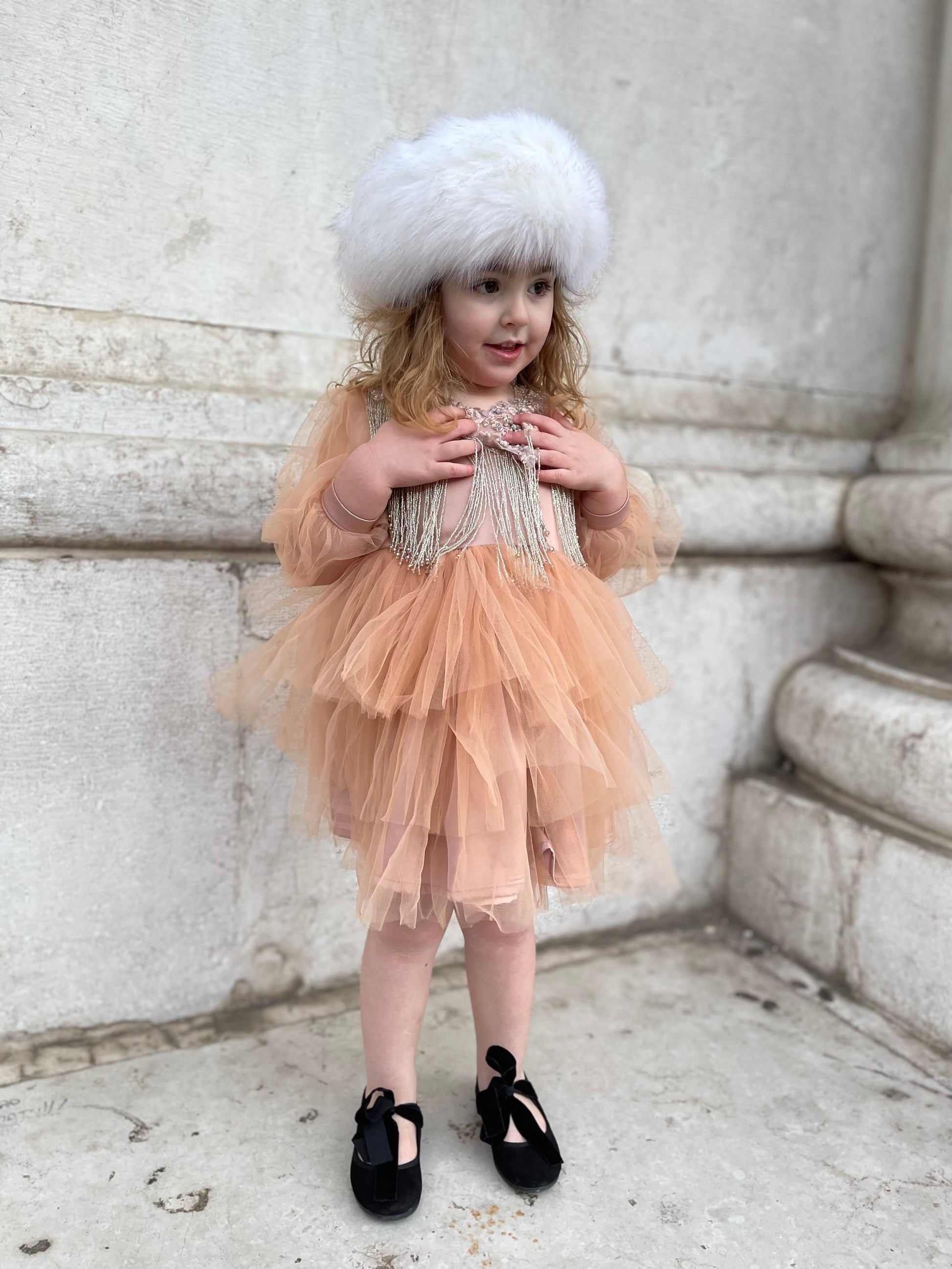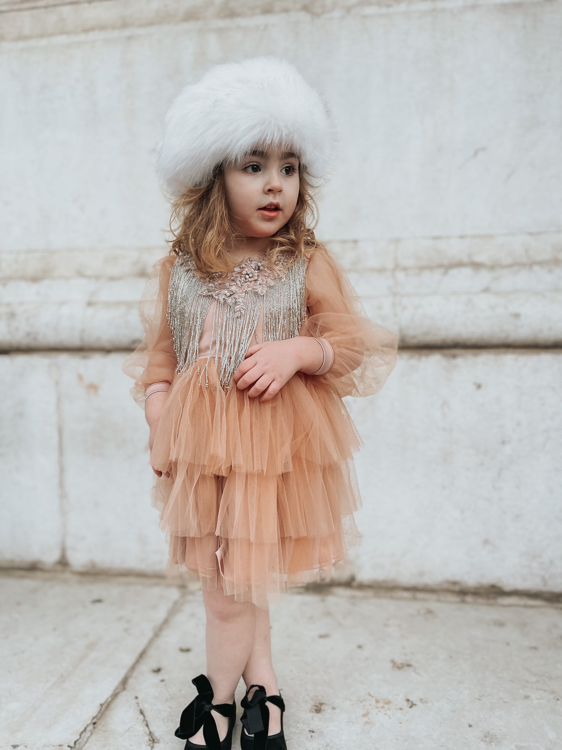 Garbi dress, fustan eventesh dhe pagezimi.Me menge te gjata transparente dhe detaje ruazash e kristalesh.
