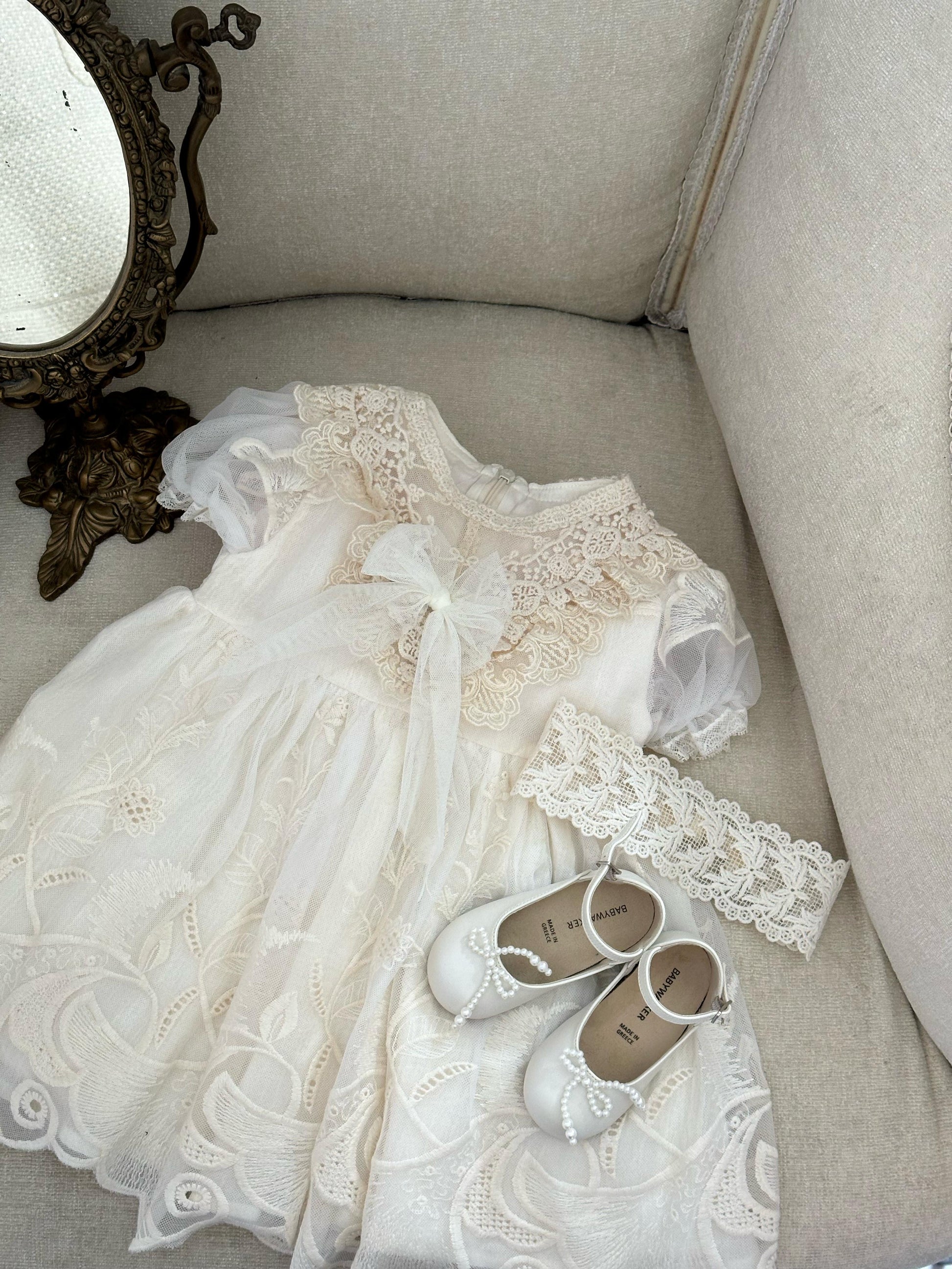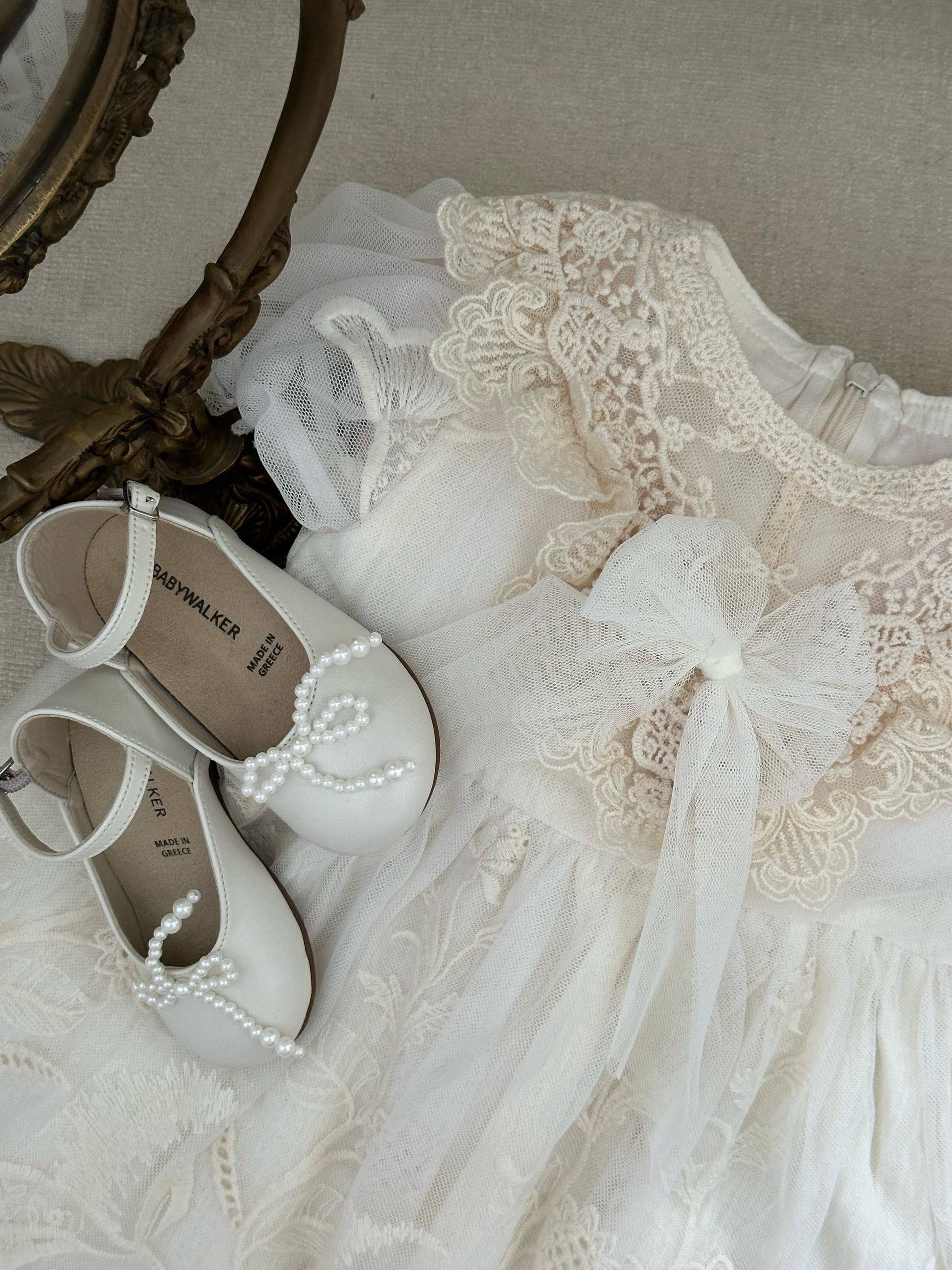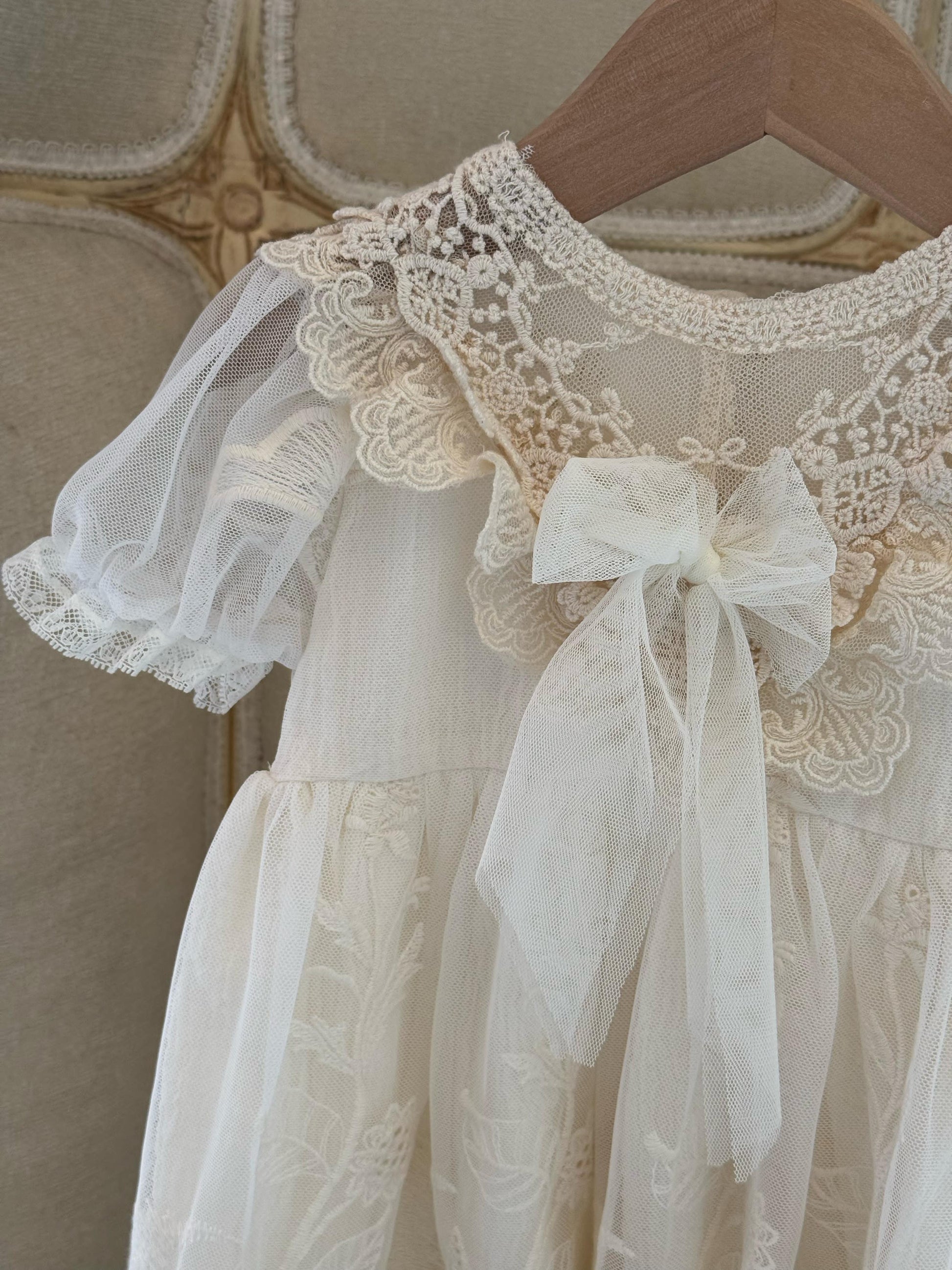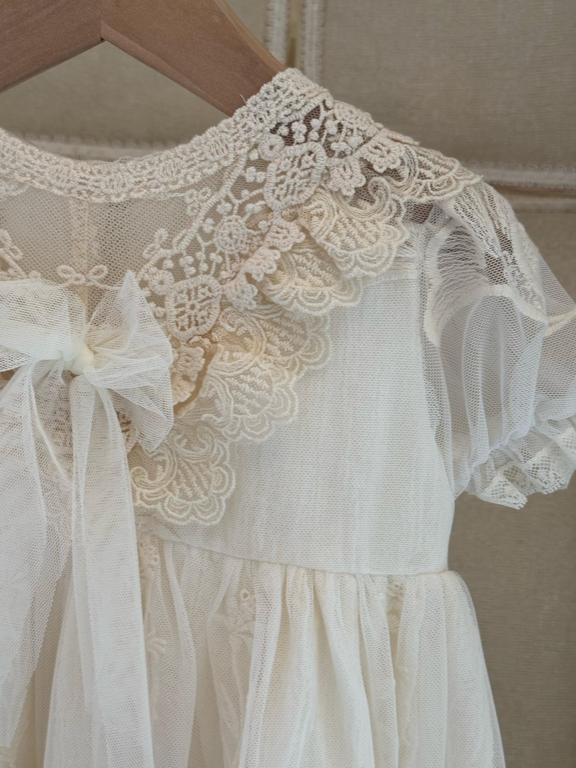 Fustan eventesh dhe pagezimesh me tantelle delikate, lino luksi e bute dhe astar.