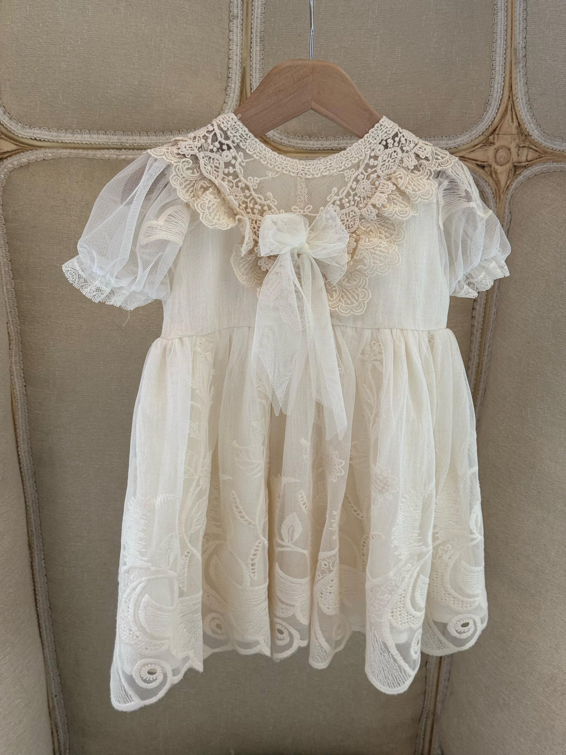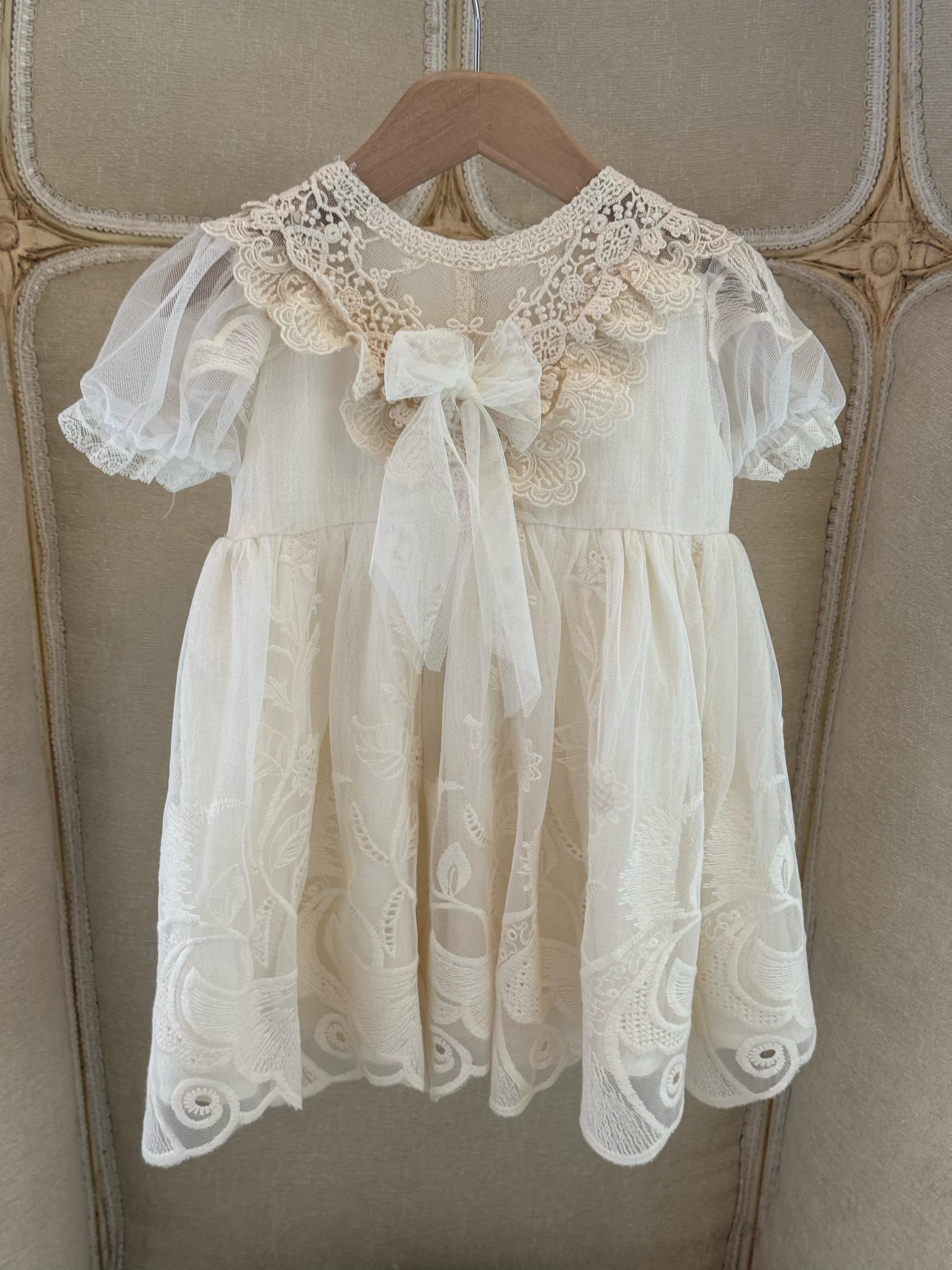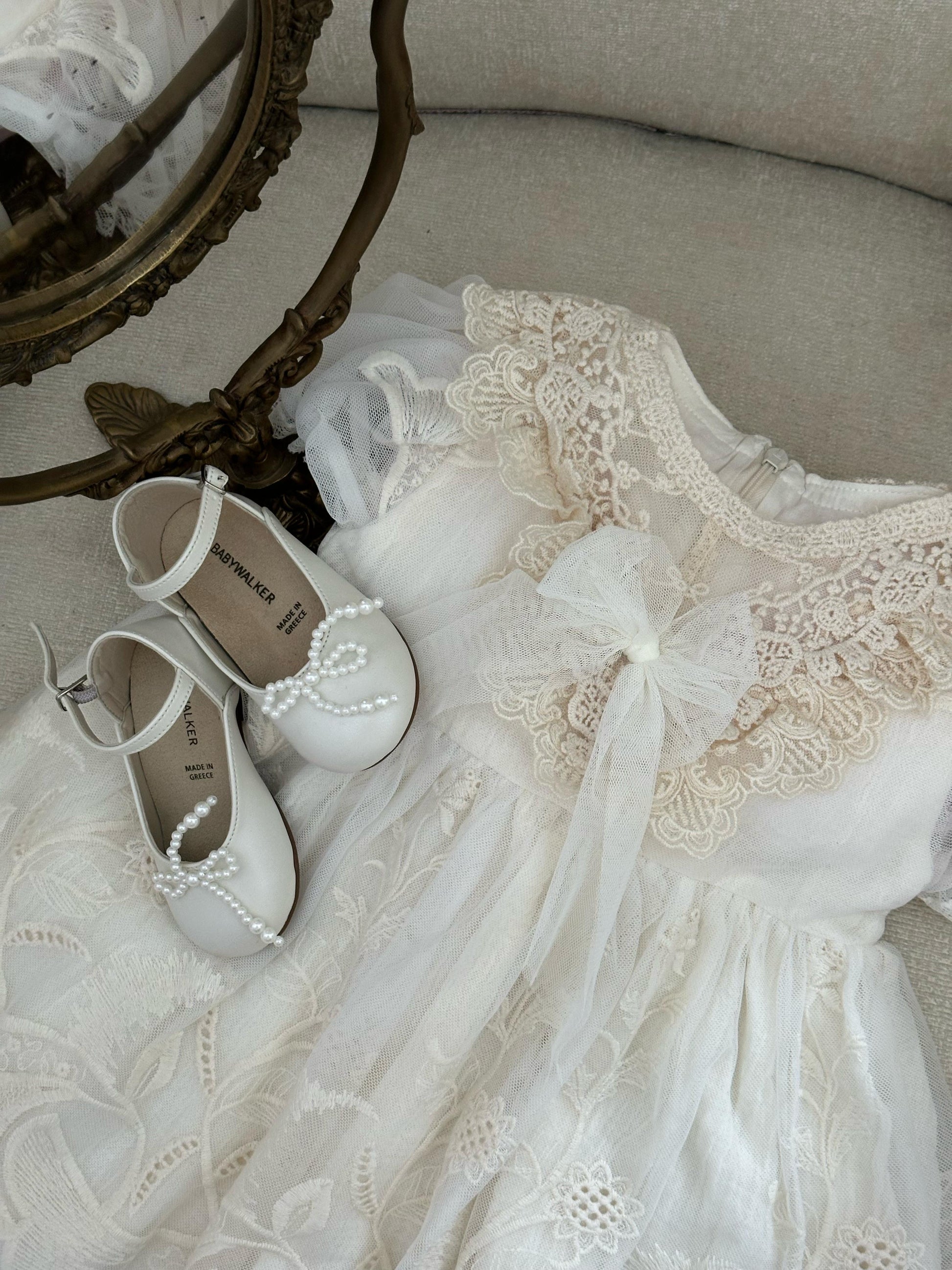 Fustan eventesh dhe pagezimesh me tantelle delikate, lino luksi e bute dhe astar.