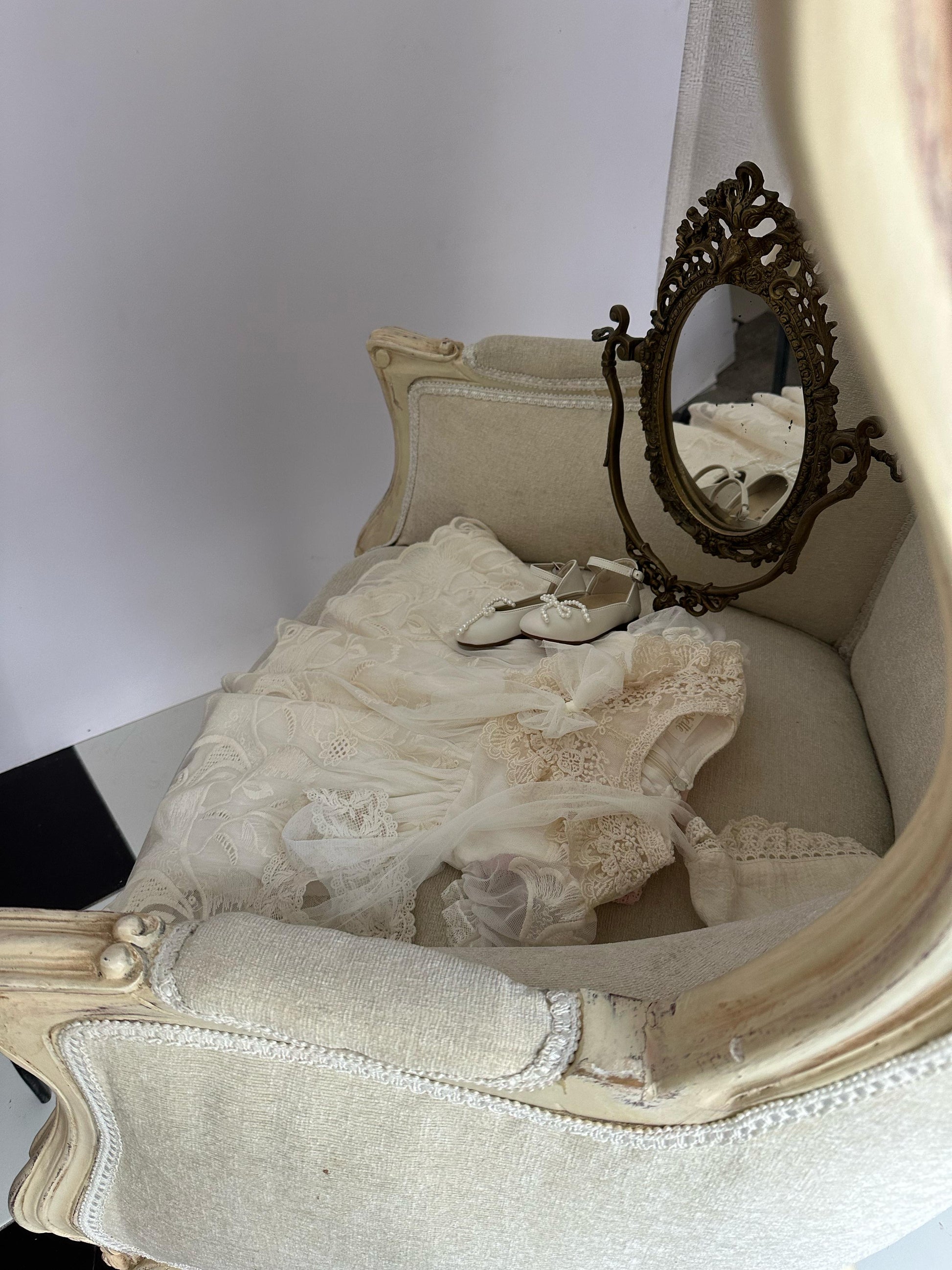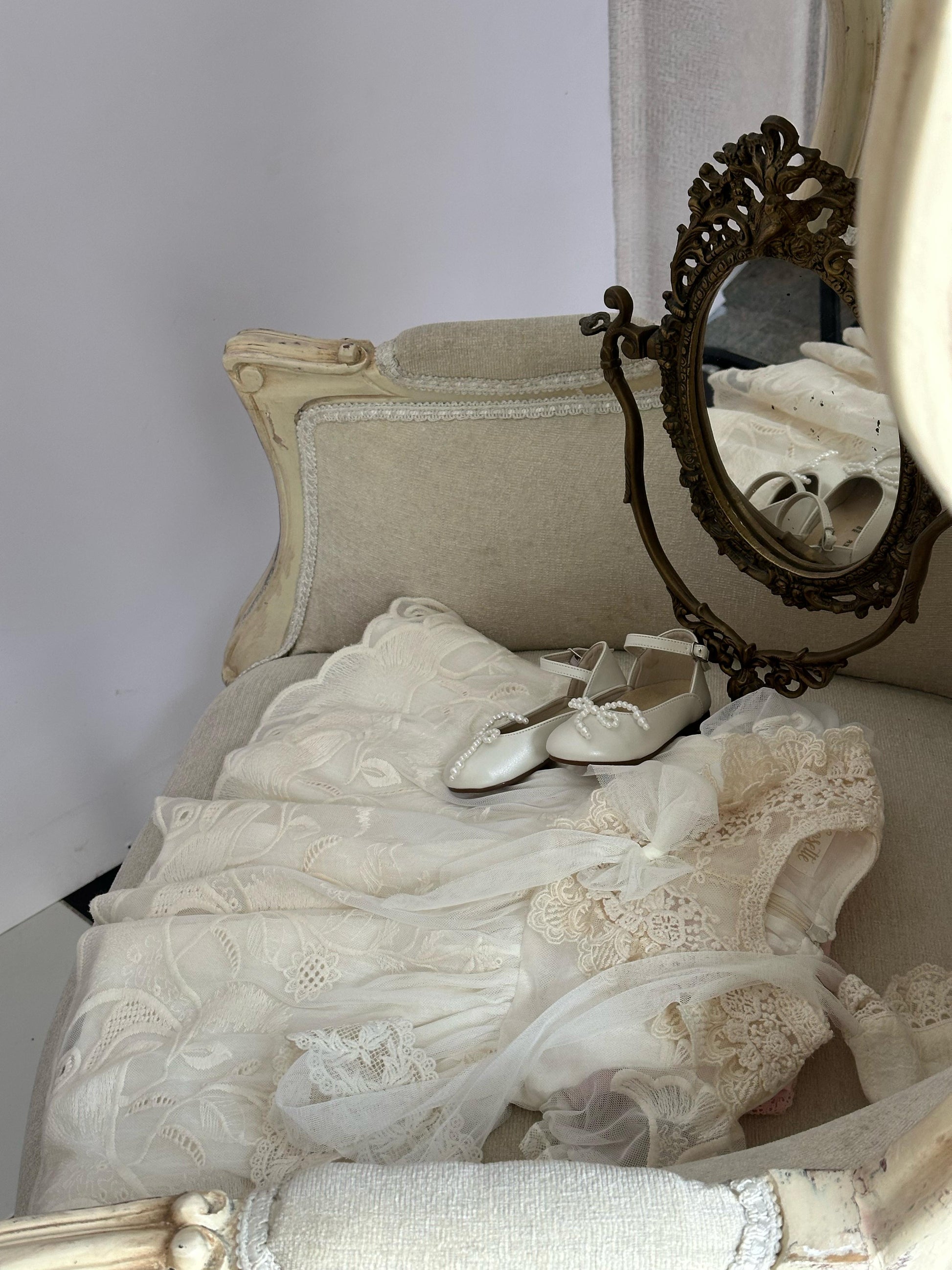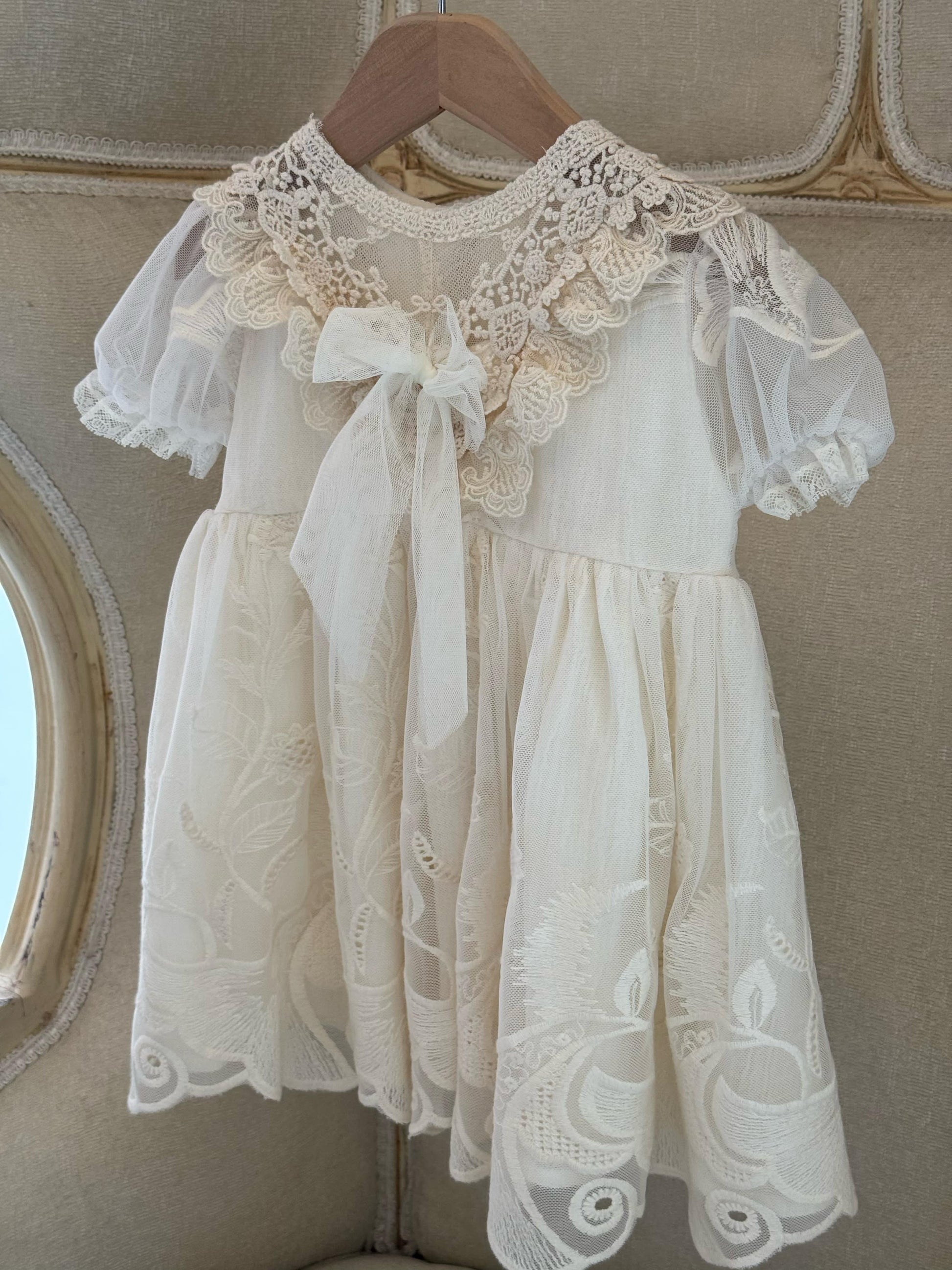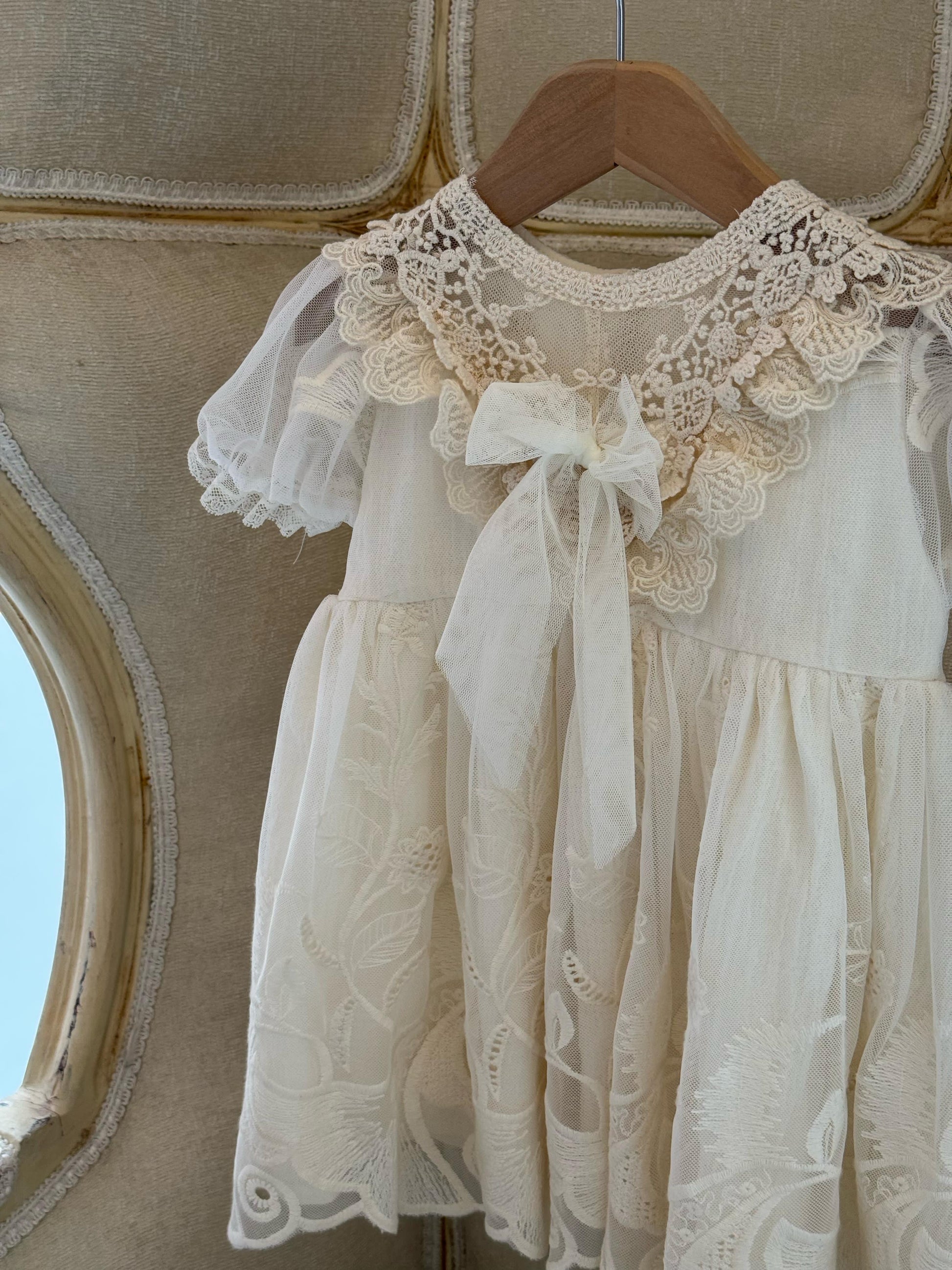 Fustan eventesh dhe pagezimesh me tantelle delikate, lino luksi e bute dhe astar.