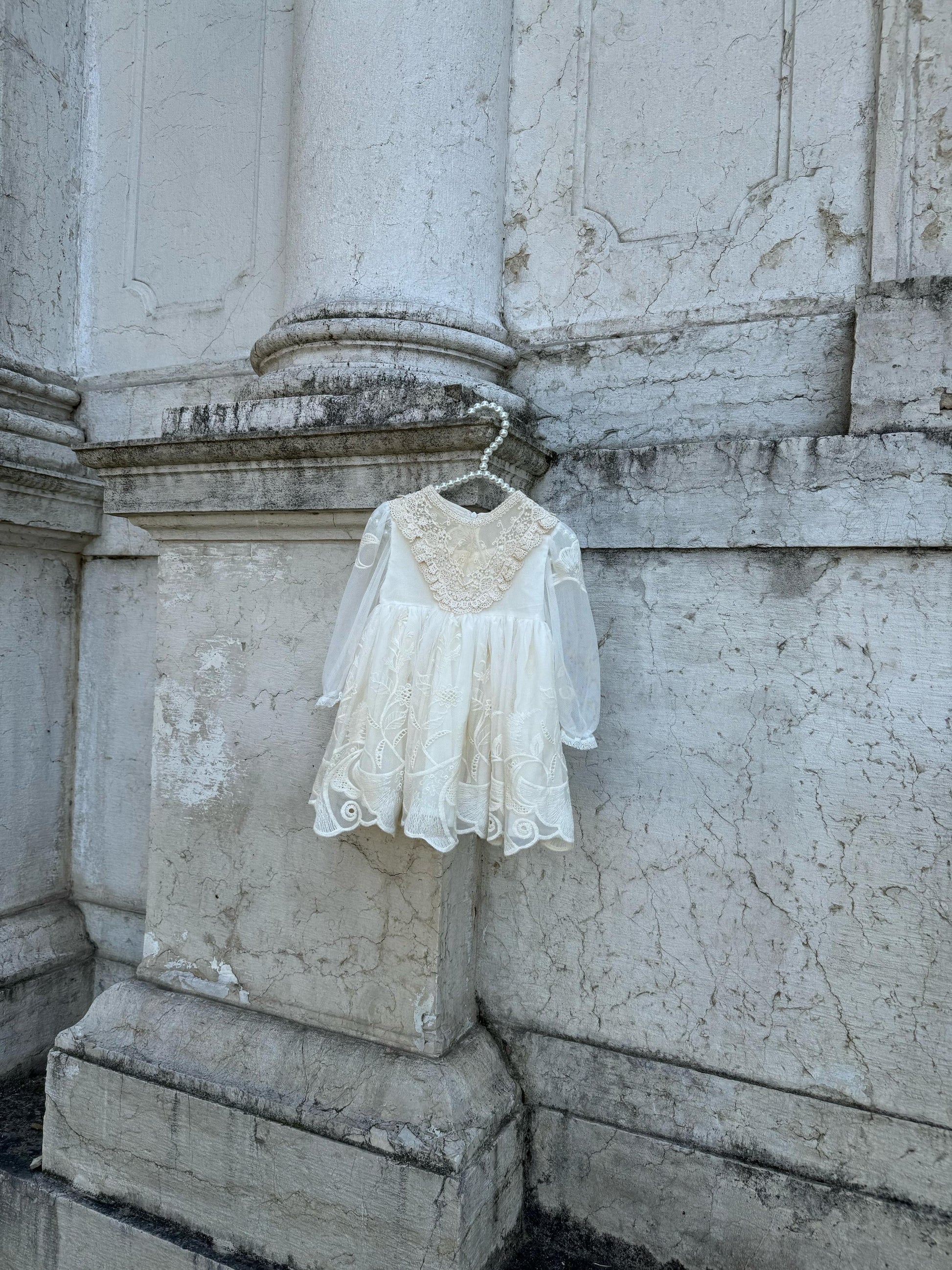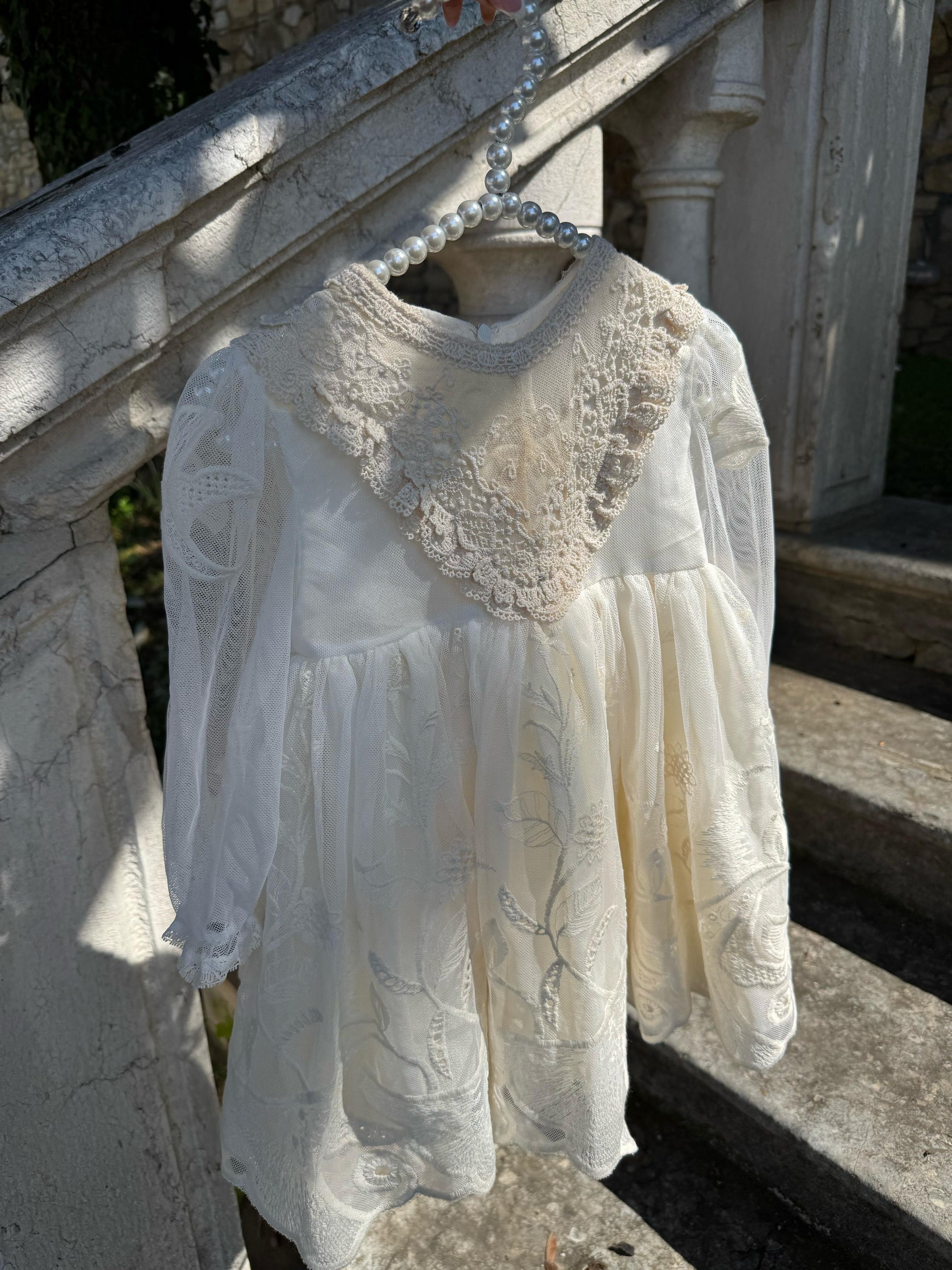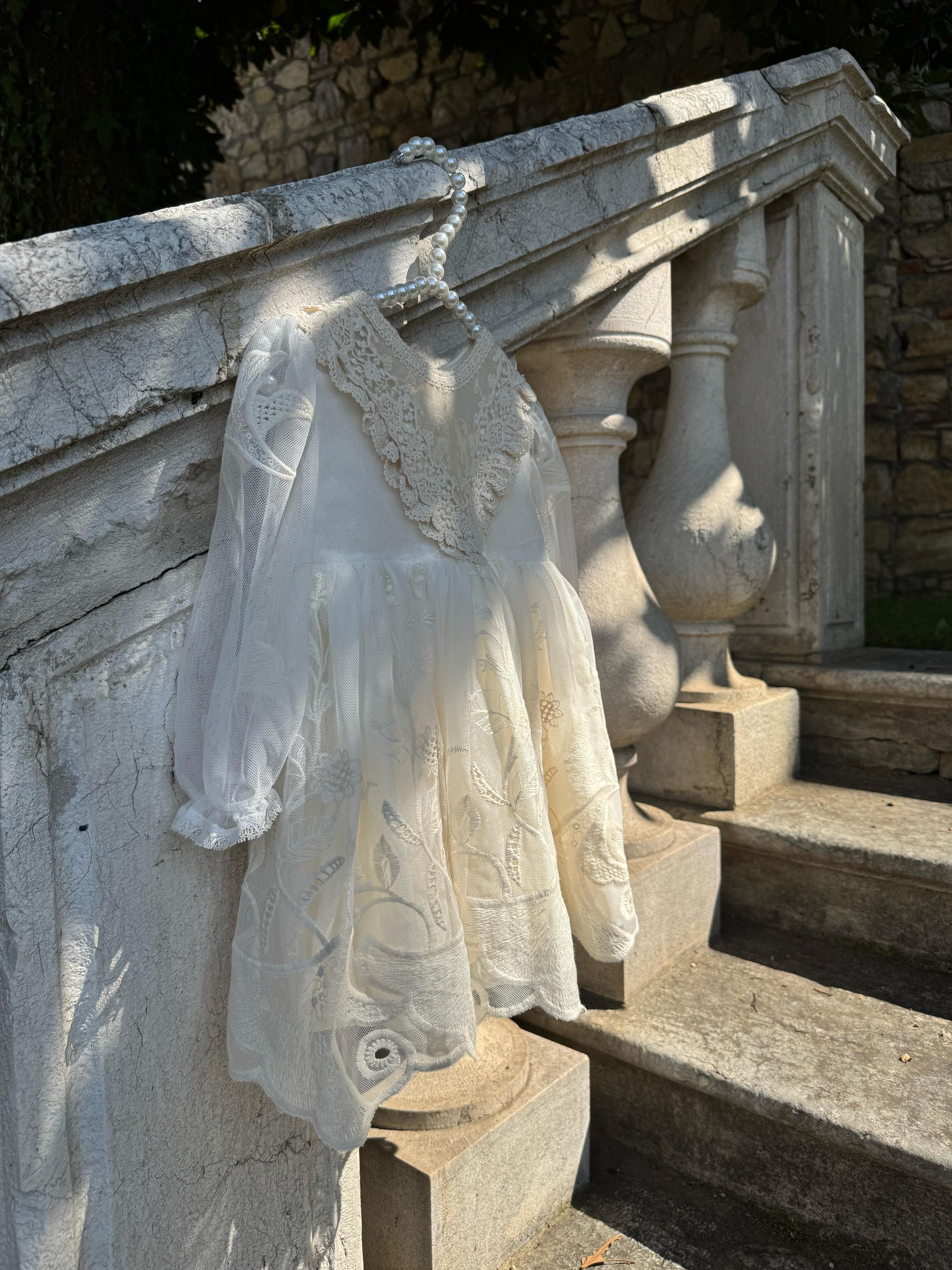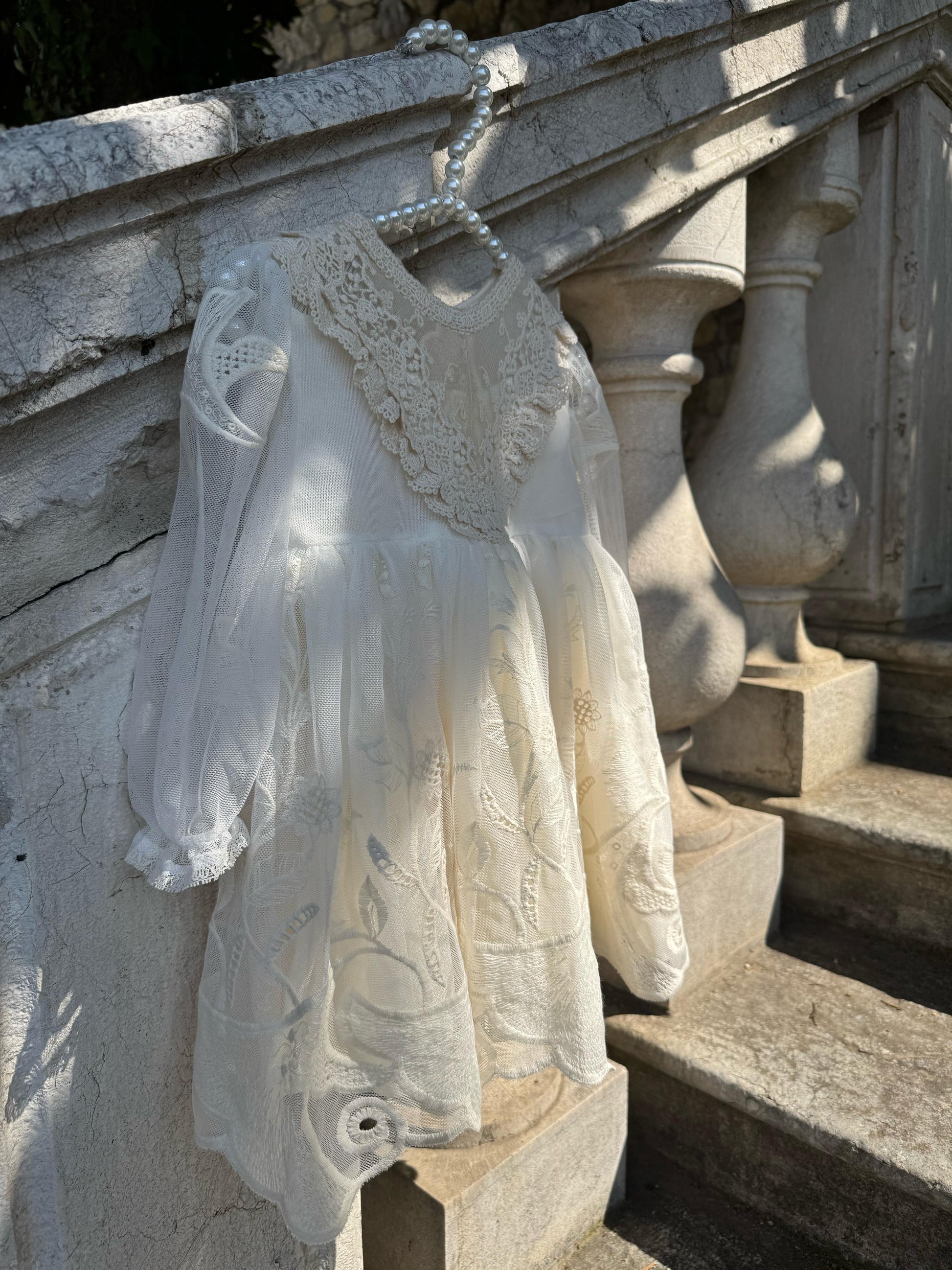 Fustan pana me menge te gjata, me detaje qendisjesh dhe lino e bute lluksi