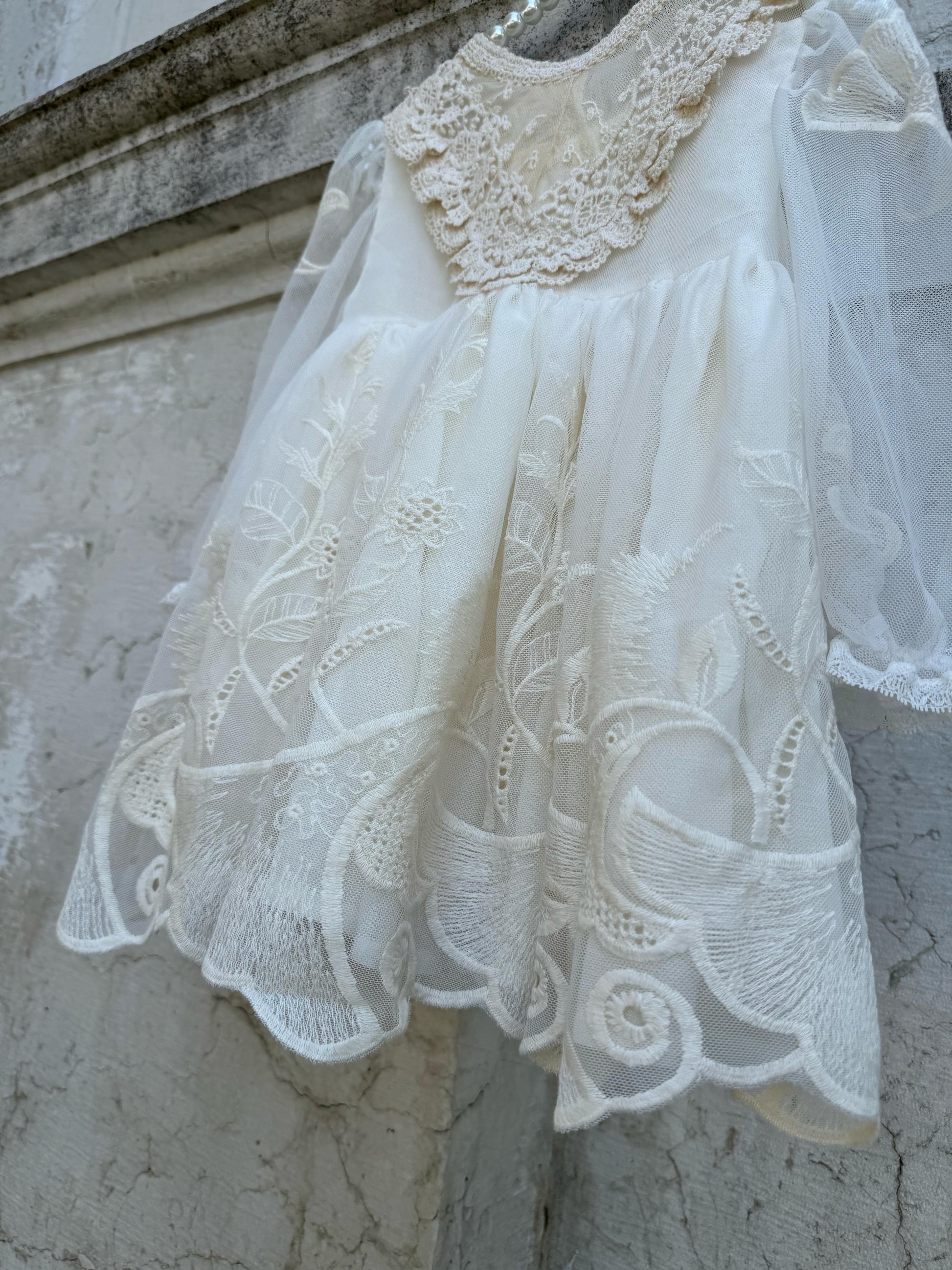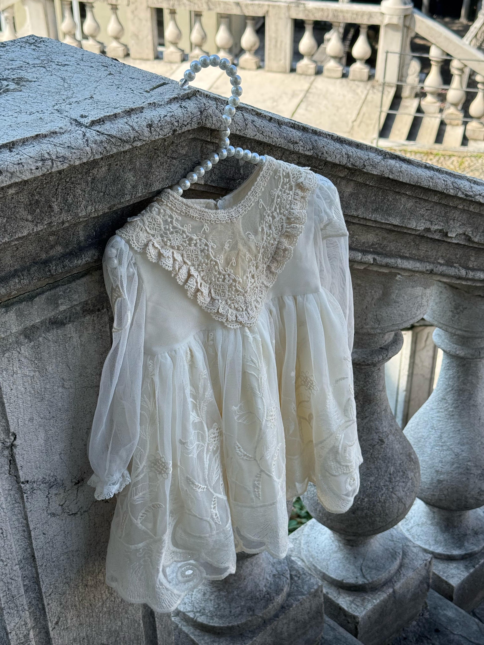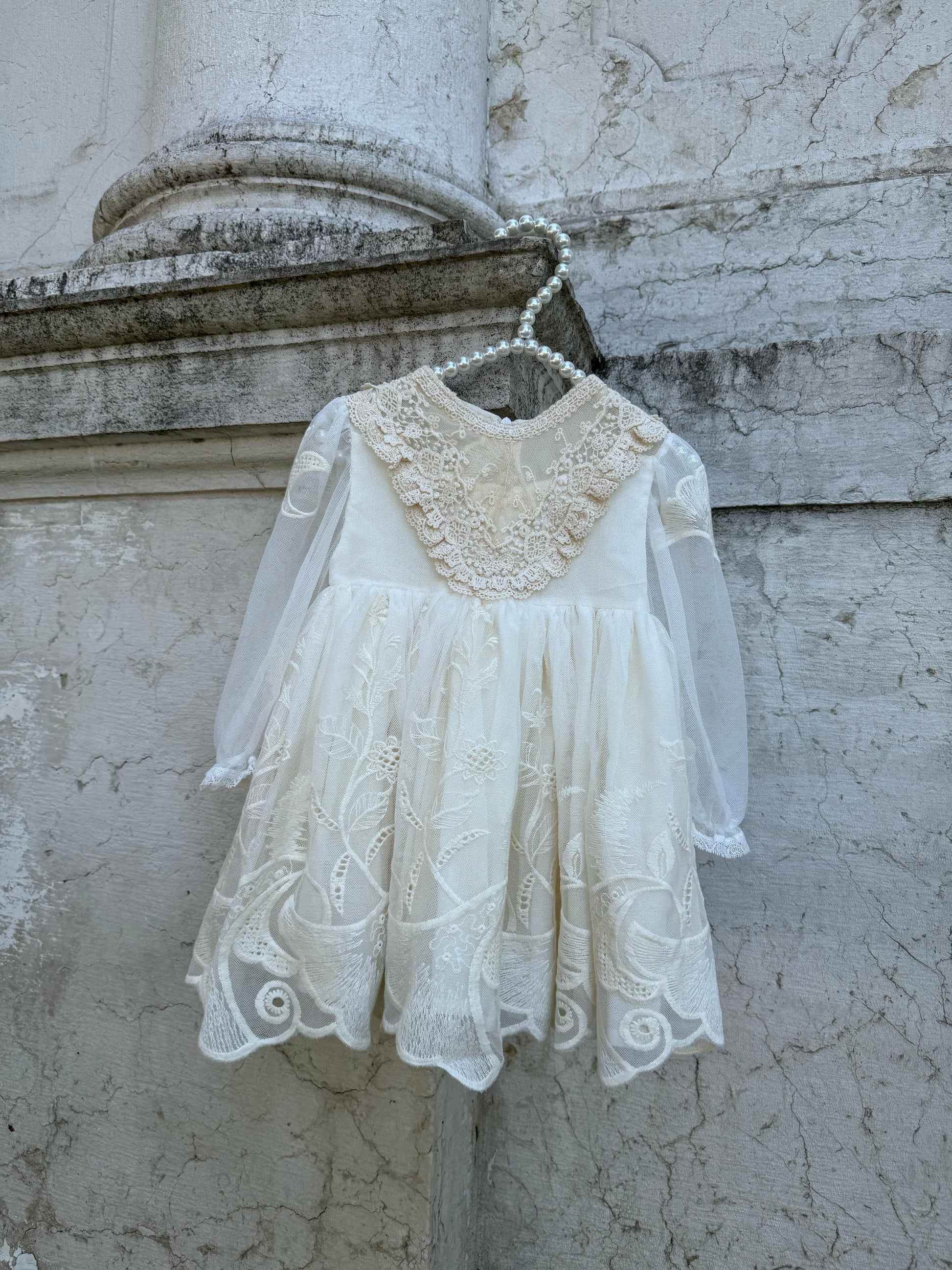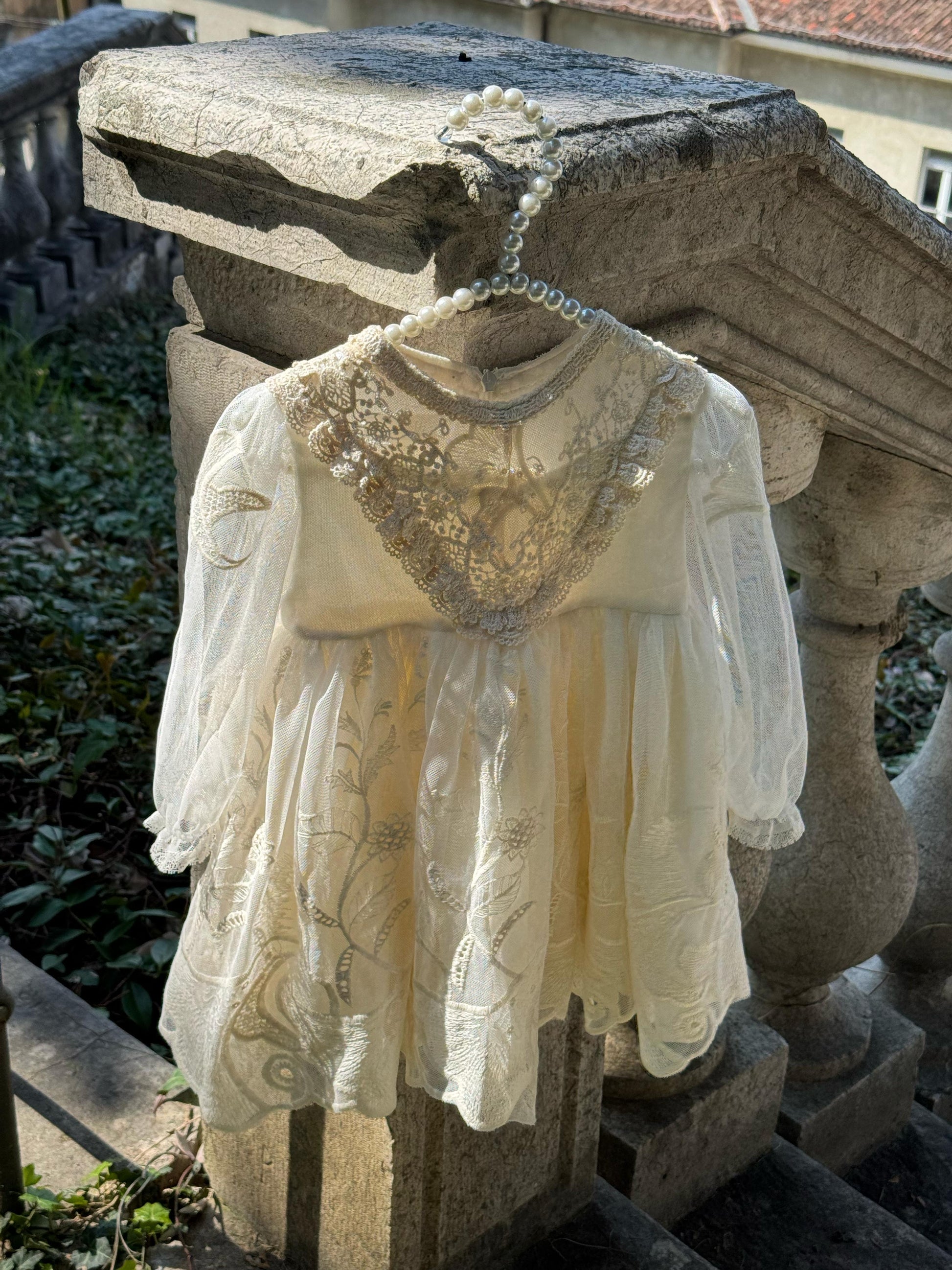 Fustan pana me menge te gjata, me detaje qendisjesh dhe lino e bute lluksi