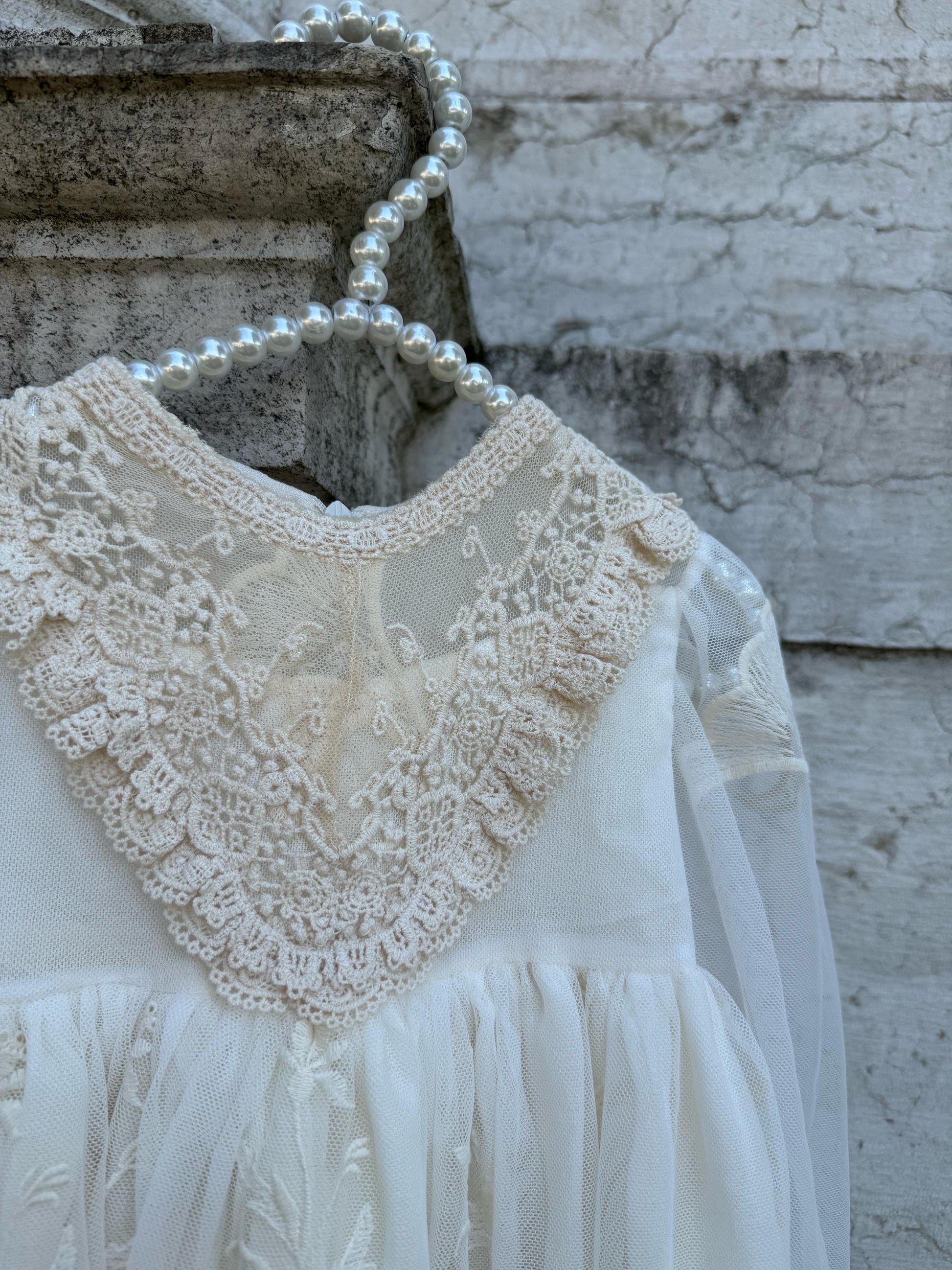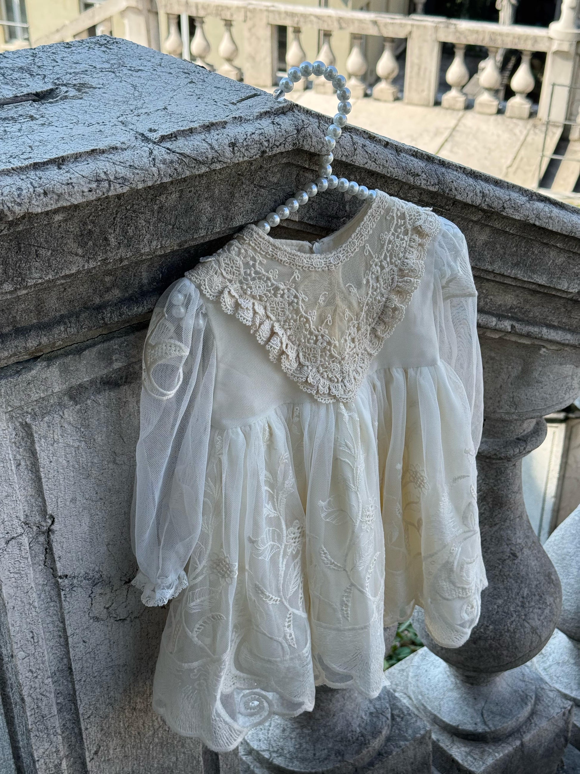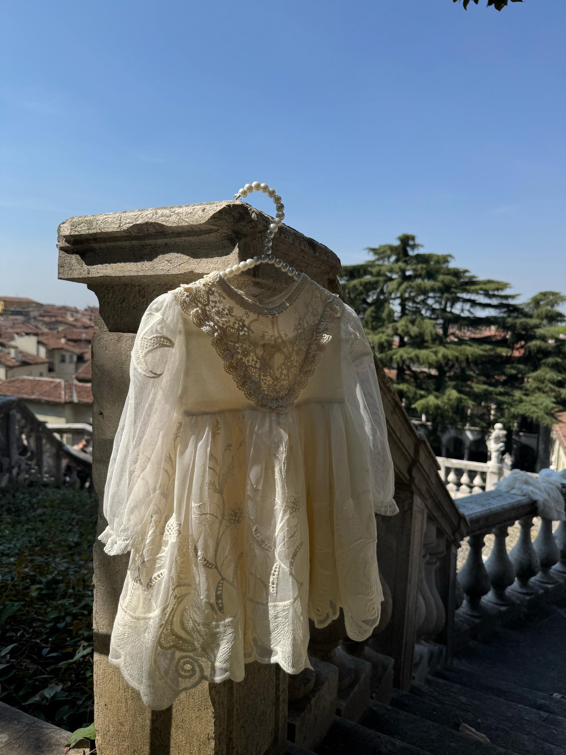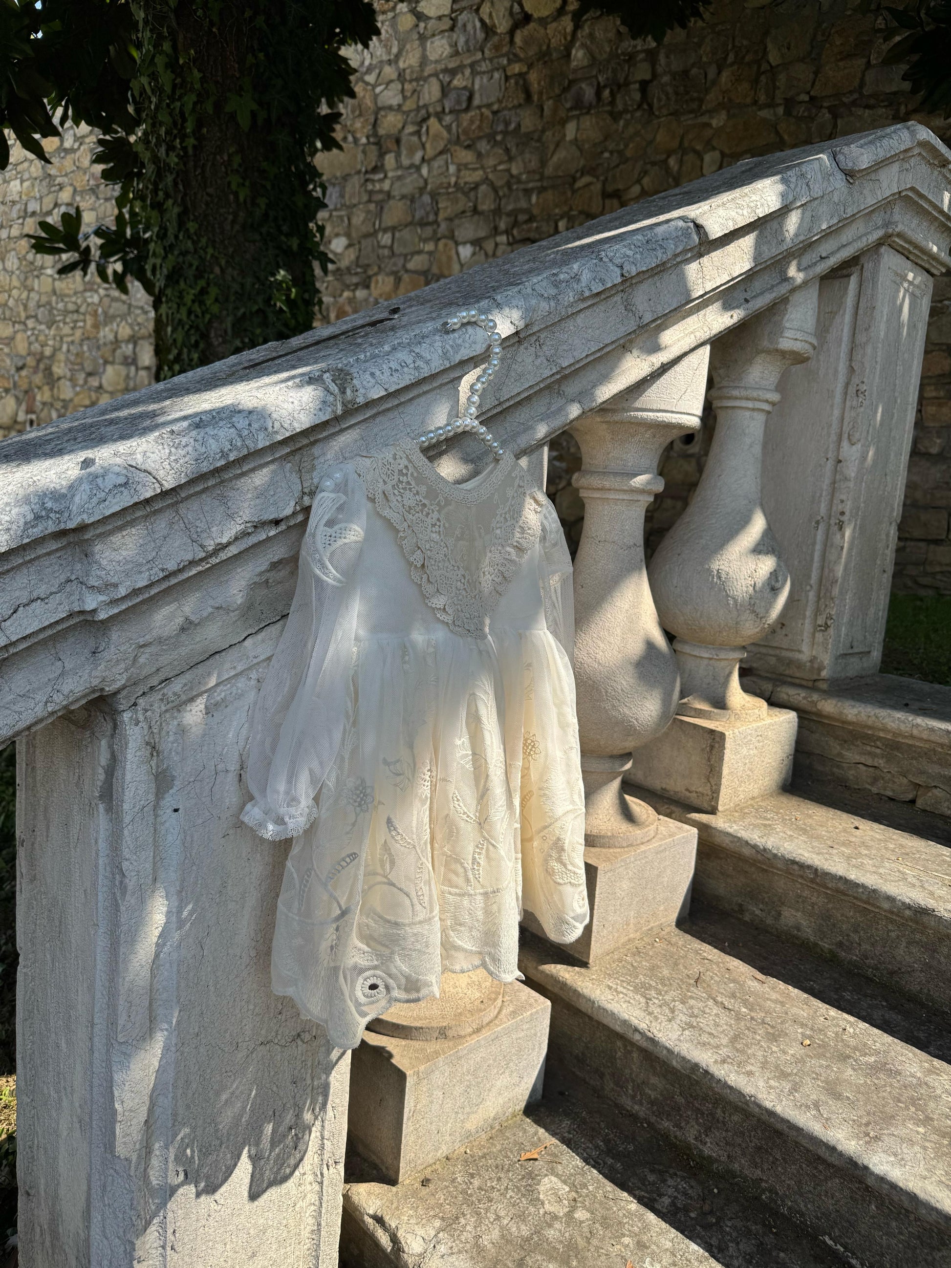Fustan pana me menge te gjata, me detaje qendisjesh dhe lino e bute lluksi