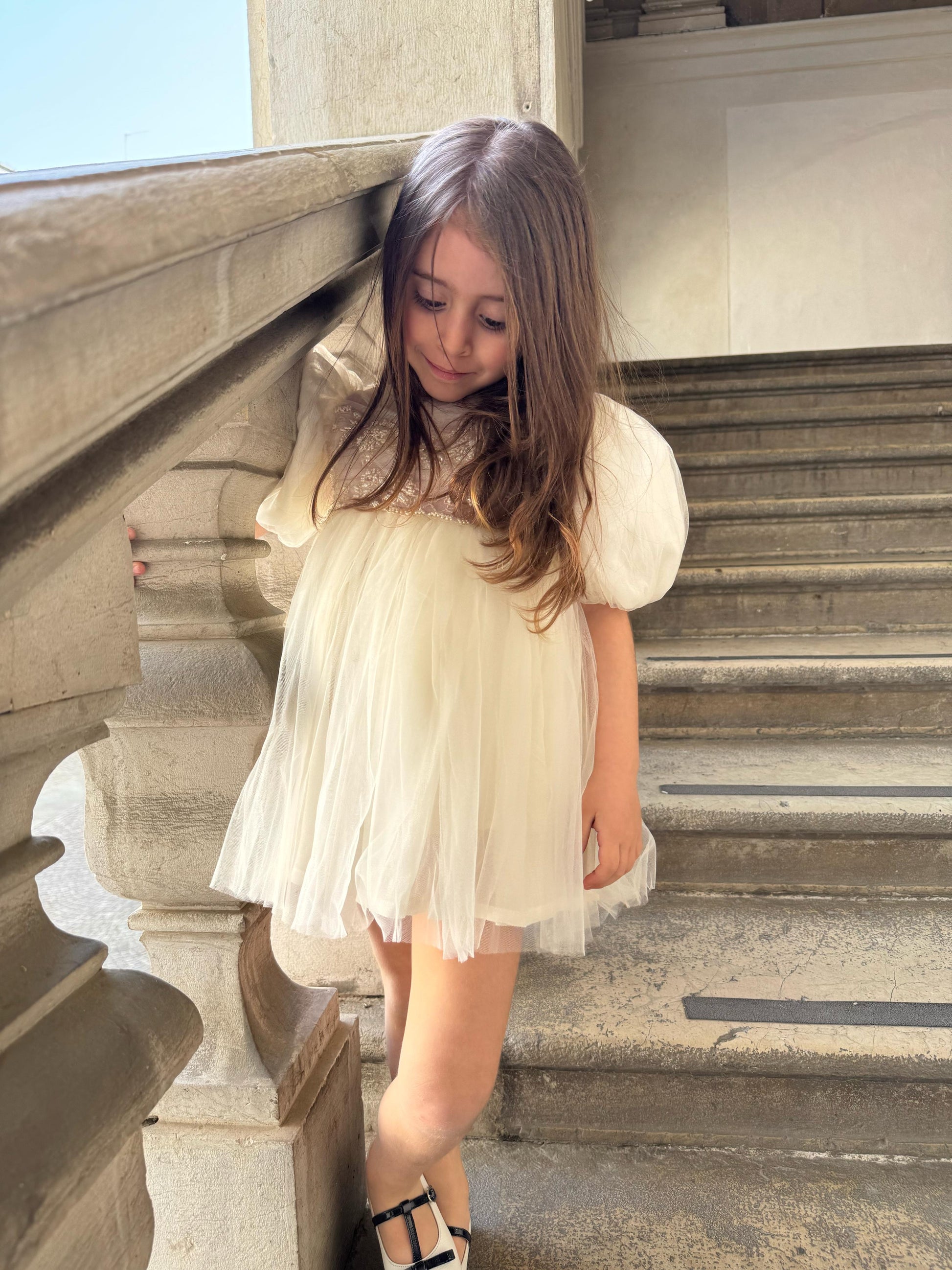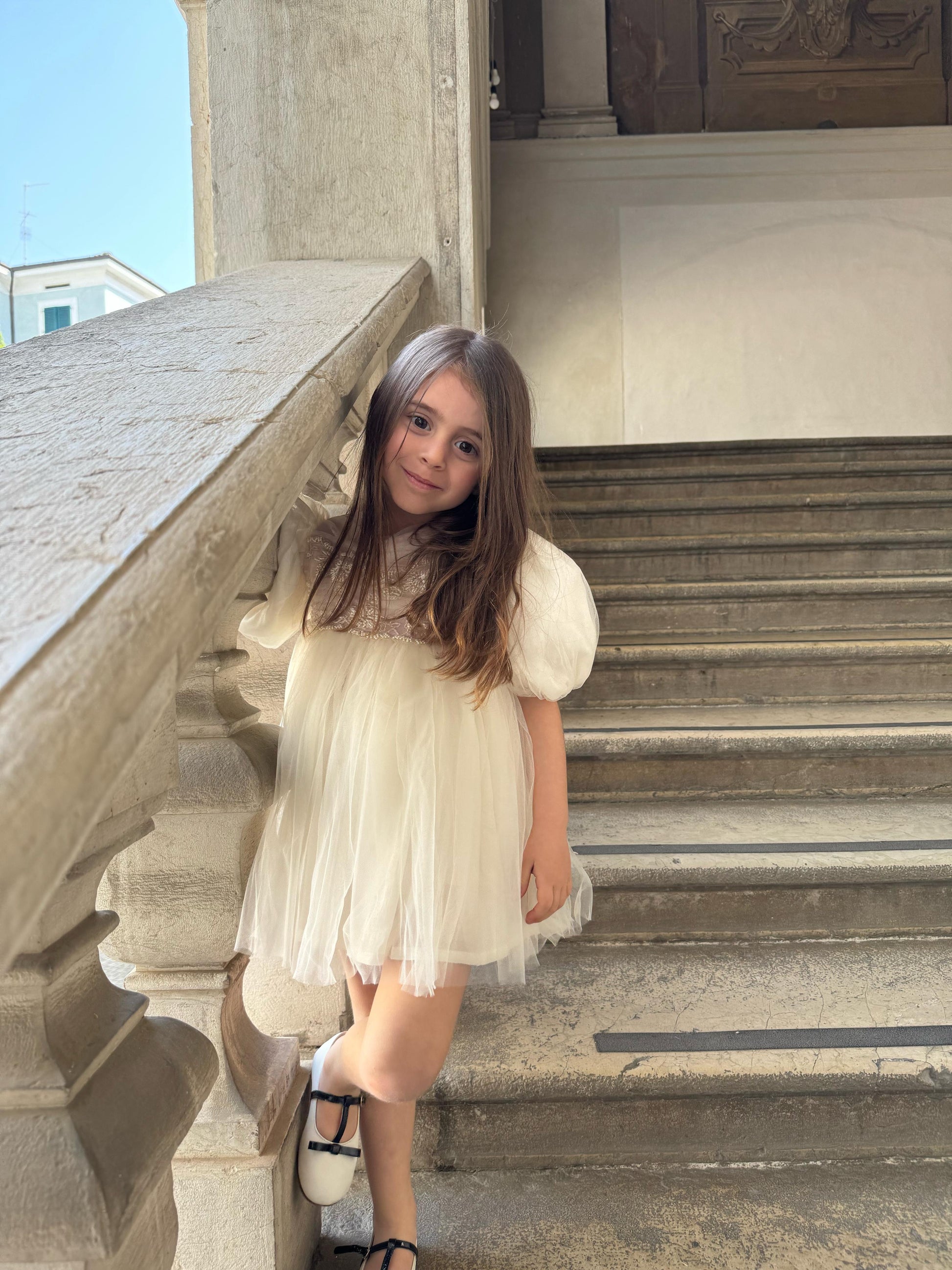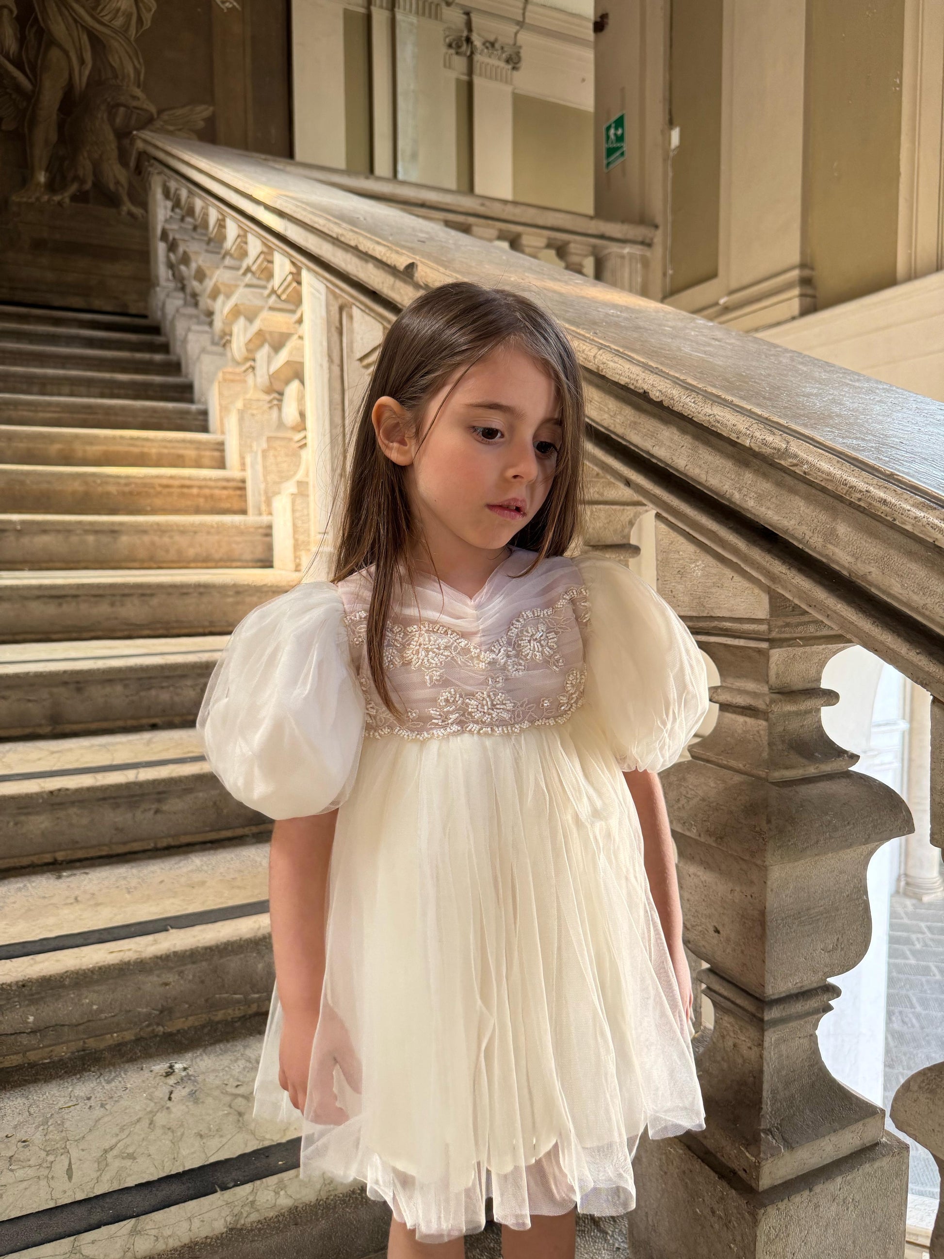 Fustan eventesh dhe pagezimesh me detaje te qendisura dhe gurre. Ngjyre pana me detaje roze