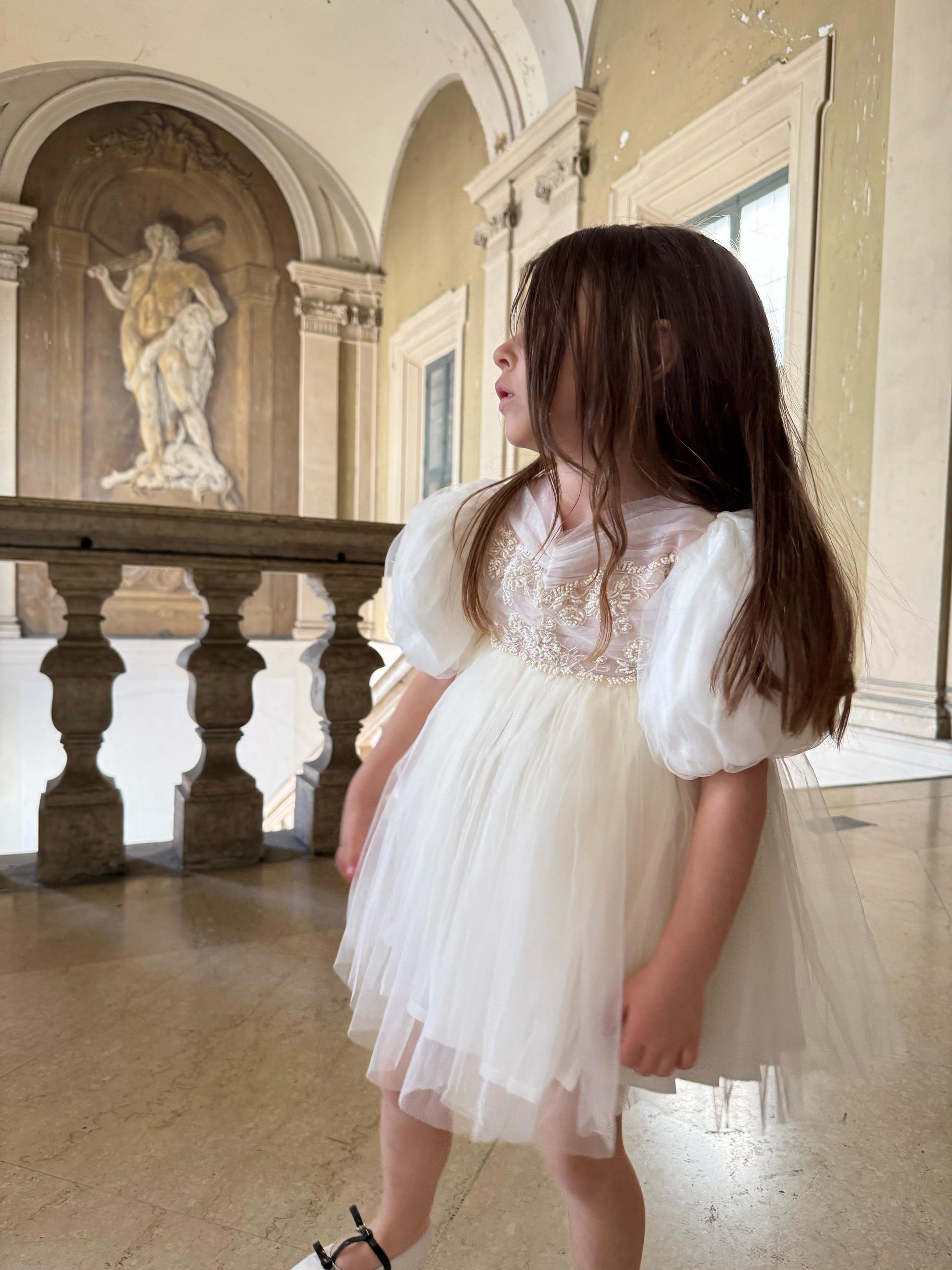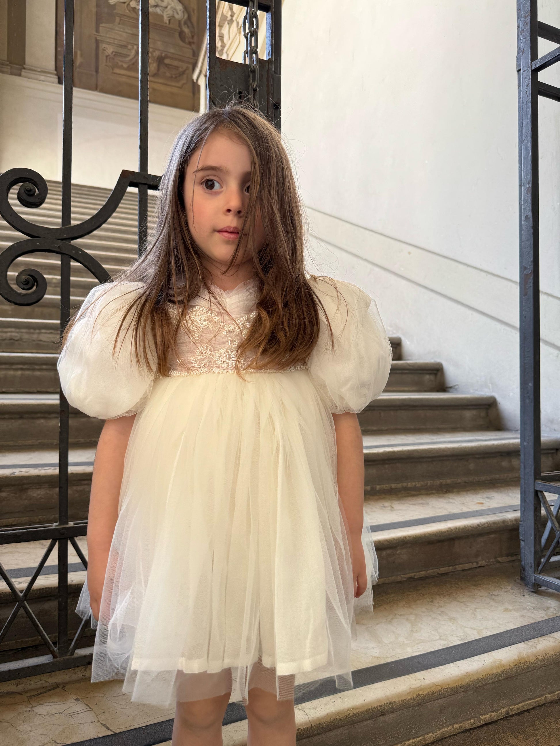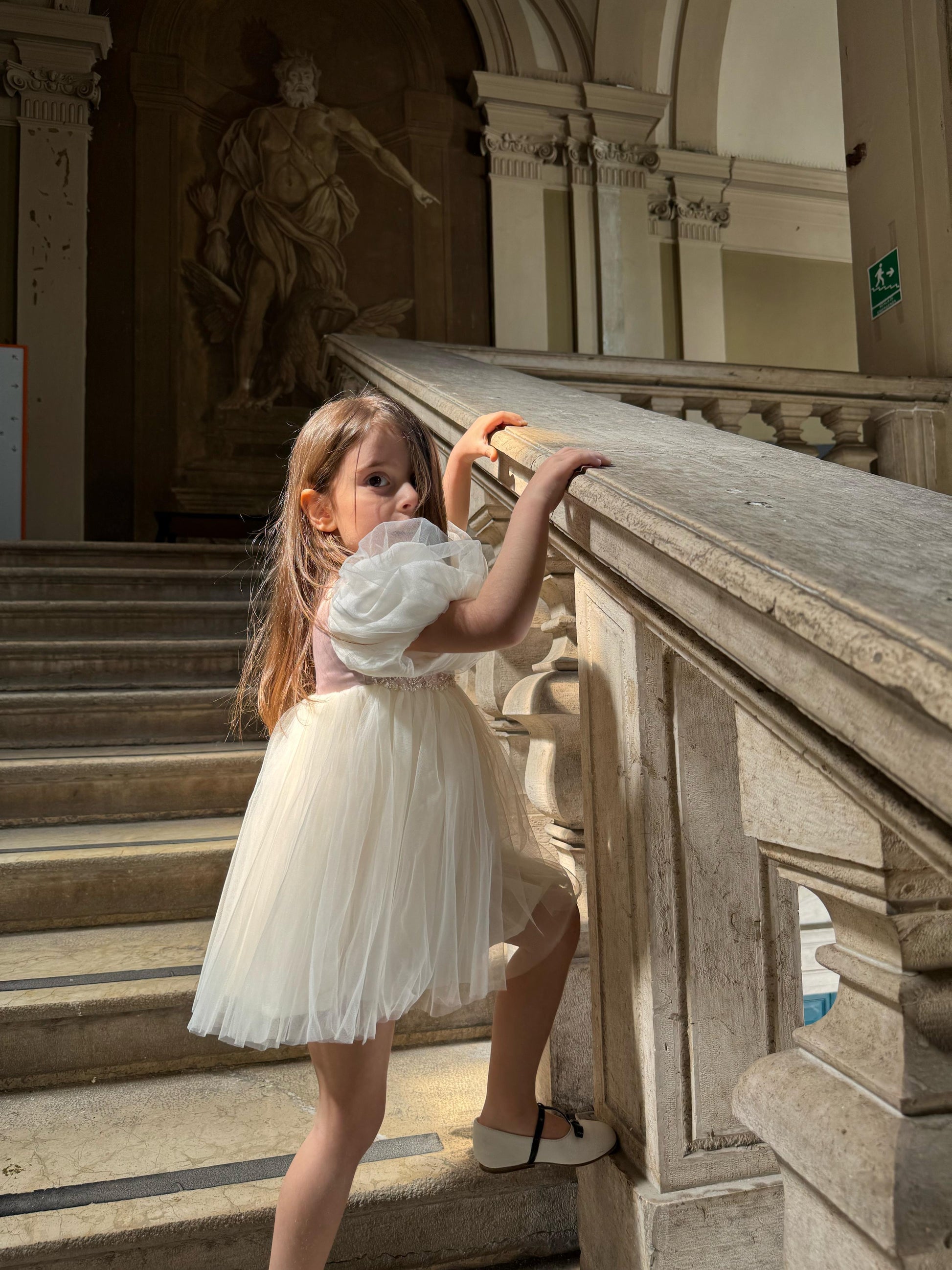 Fustan eventesh dhe pagezimesh me detaje te qendisura dhe gurre. Ngjyre pana me detaje roze