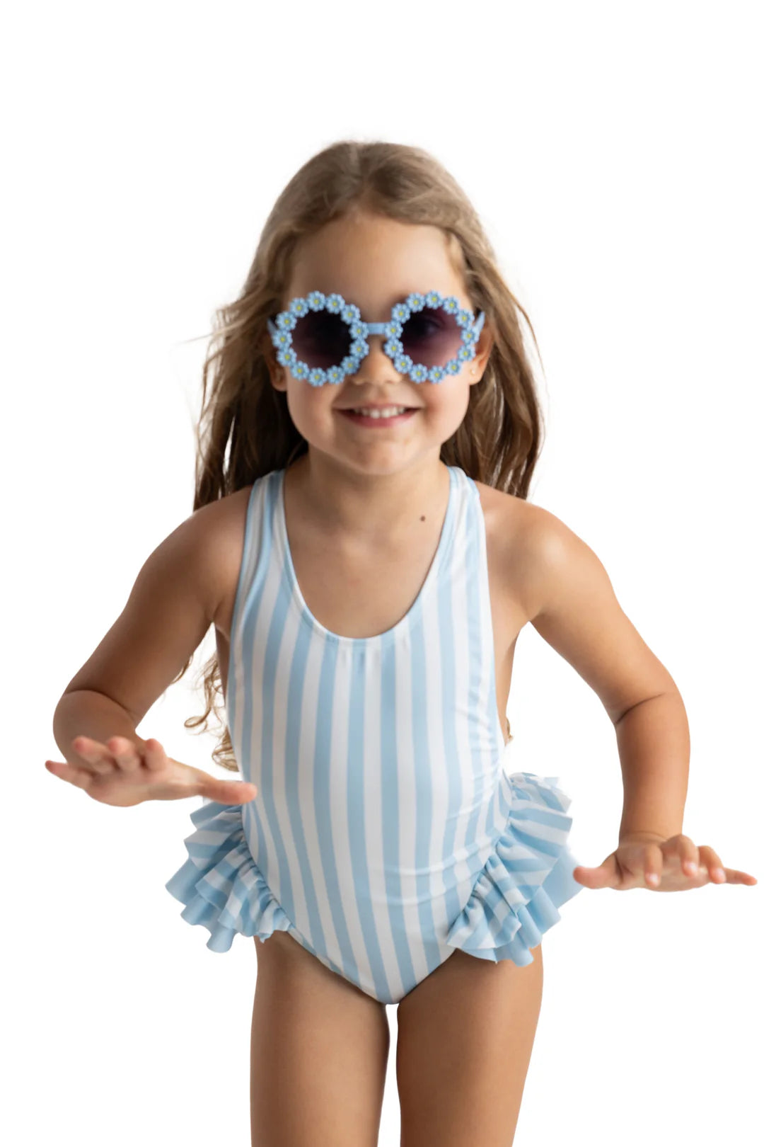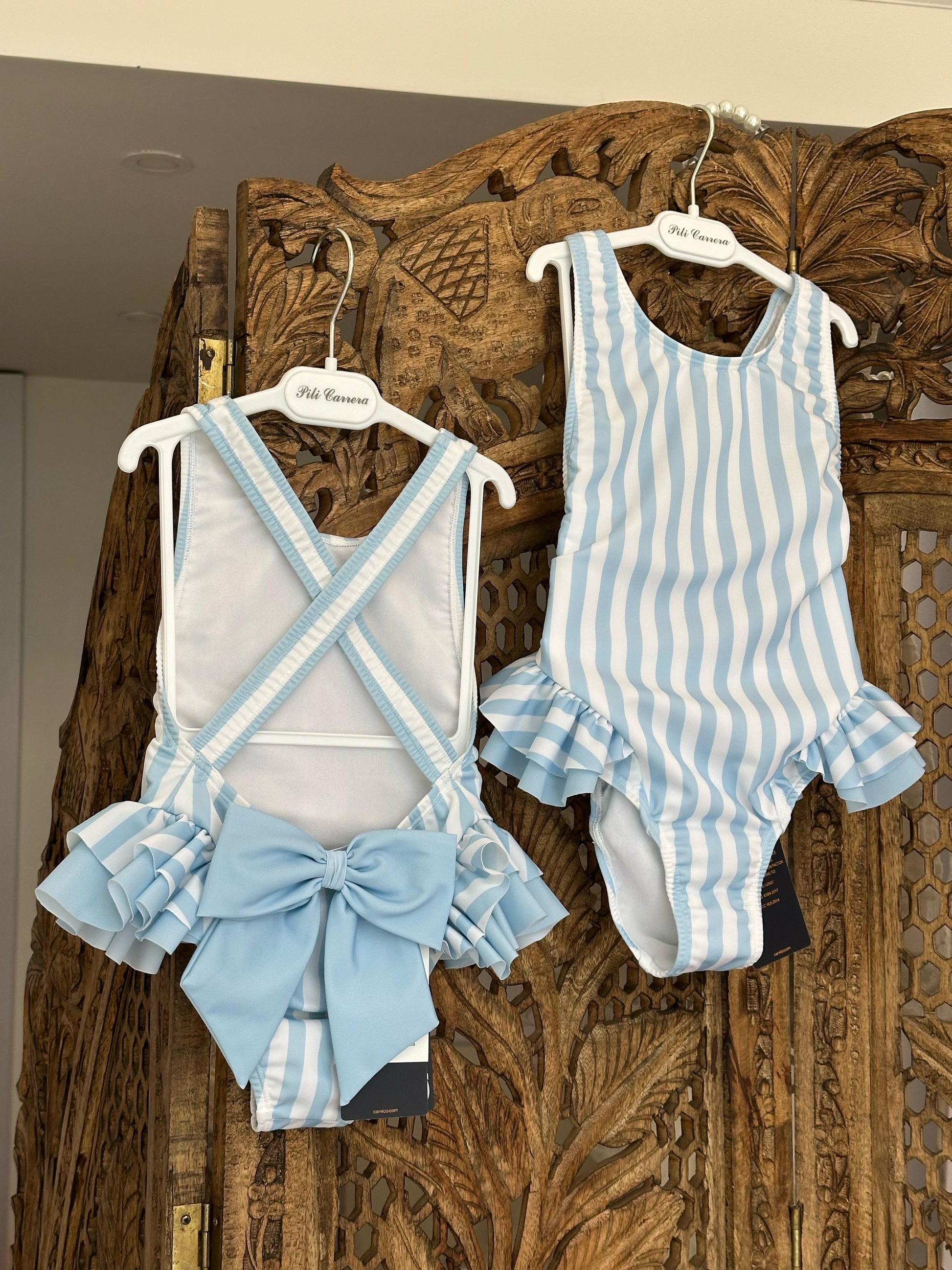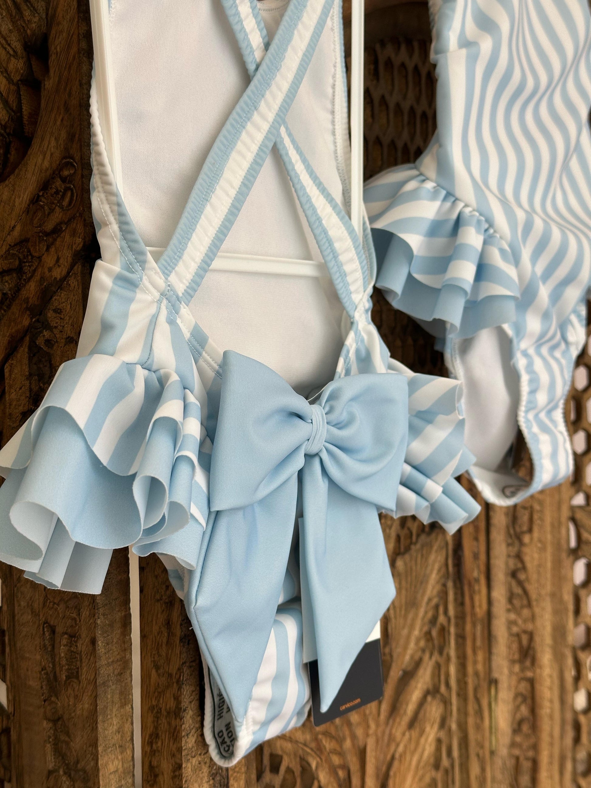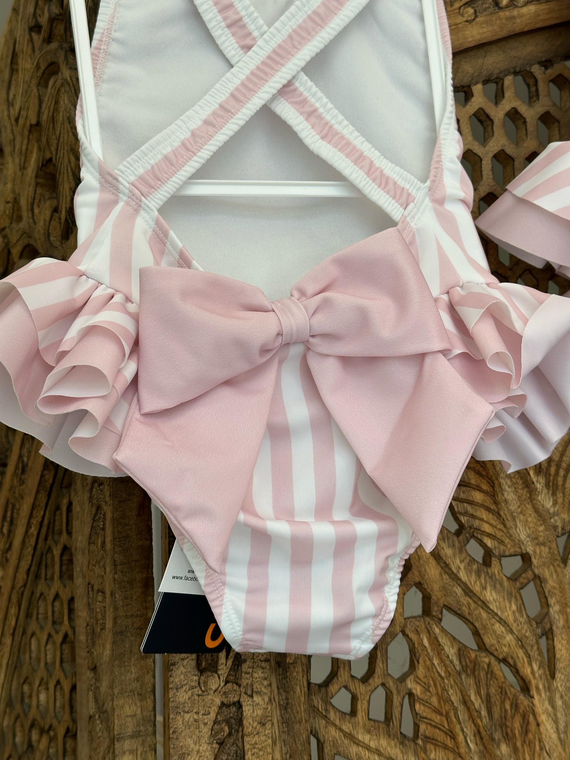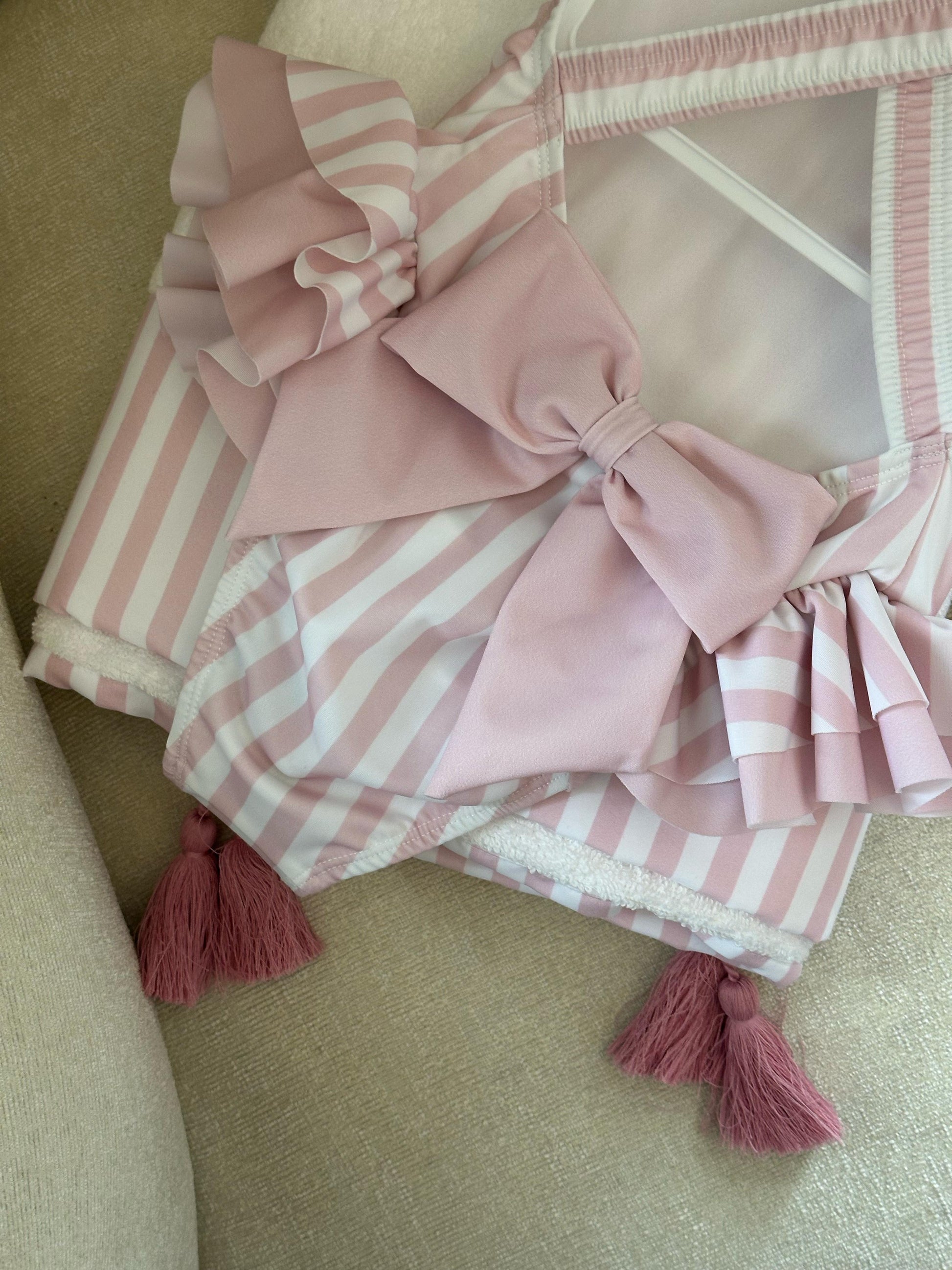 Roba banjo me trup, me shpinen jasht dhe fjongo mbrapa e frula anesore. Print me vija.