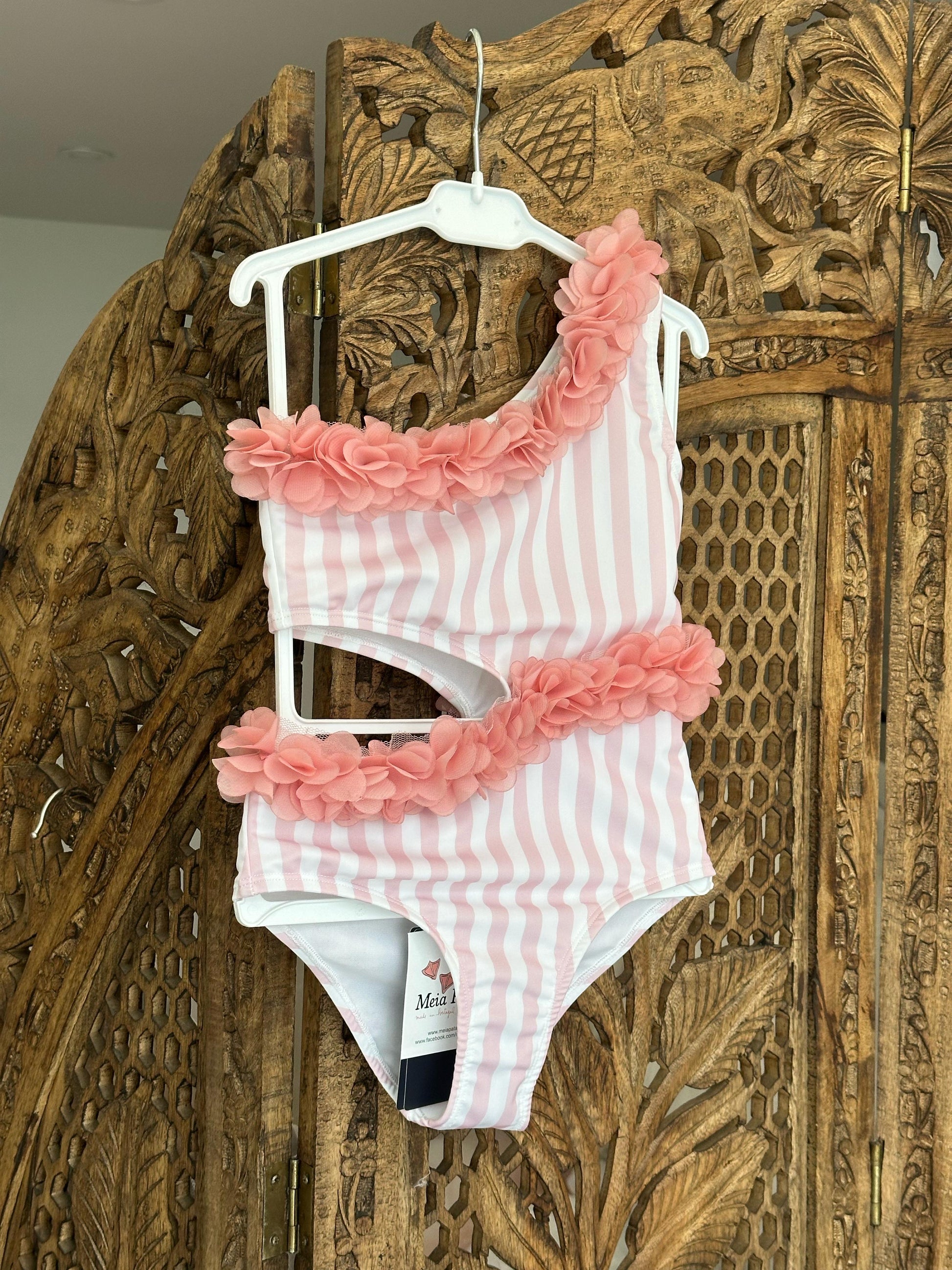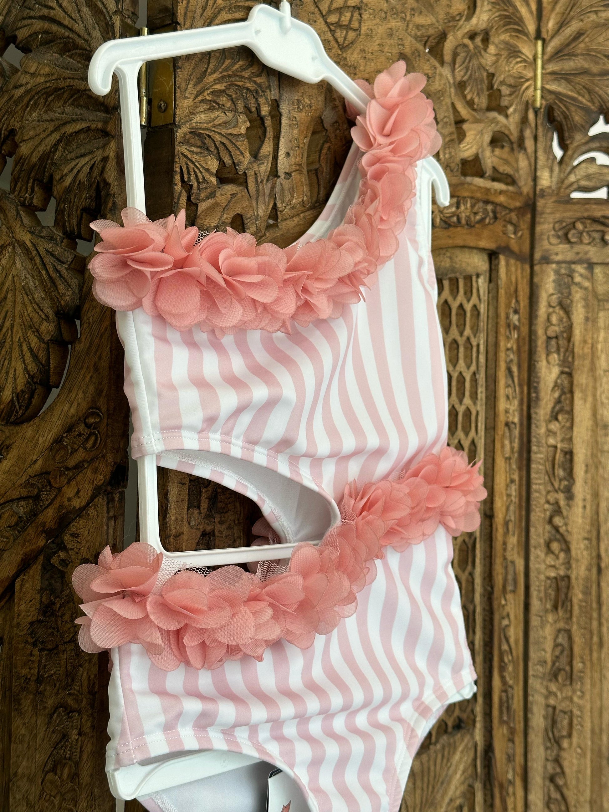 Rroba banje me trup, me vija rozë dhe të bardha, theksuar me lule 3D prej tyli në supe dhe bel.Dizajni asimetrik me prerje në bel ofron një stil të veçantë dhe unik.