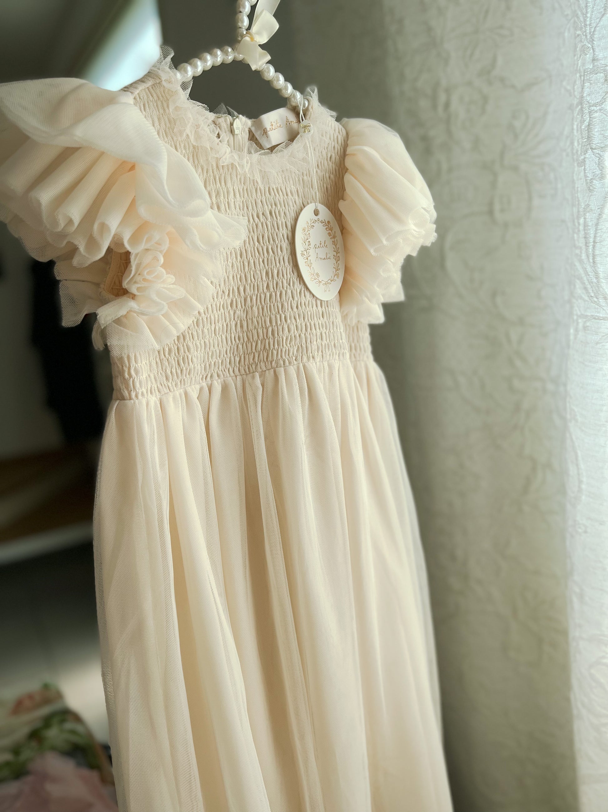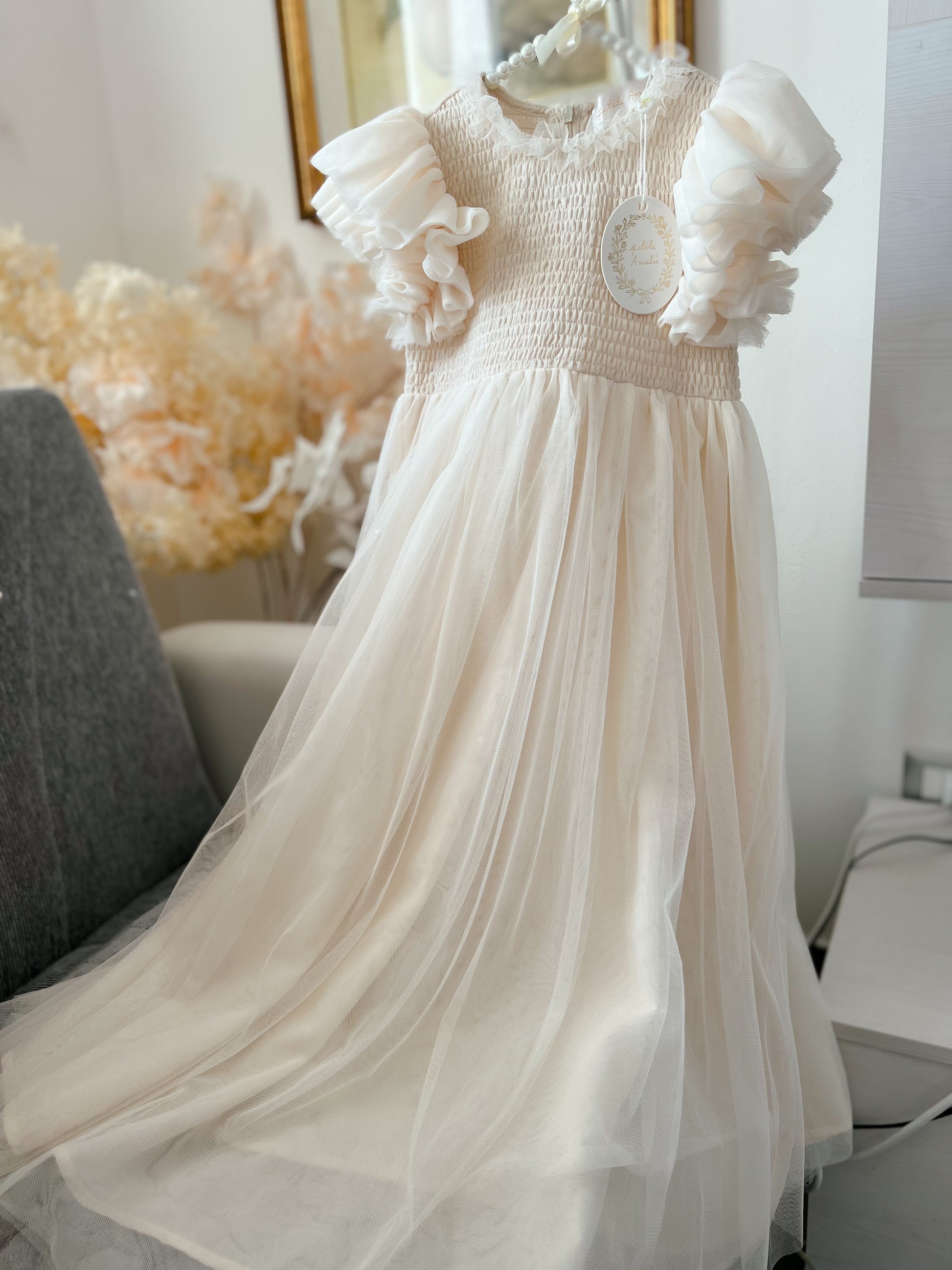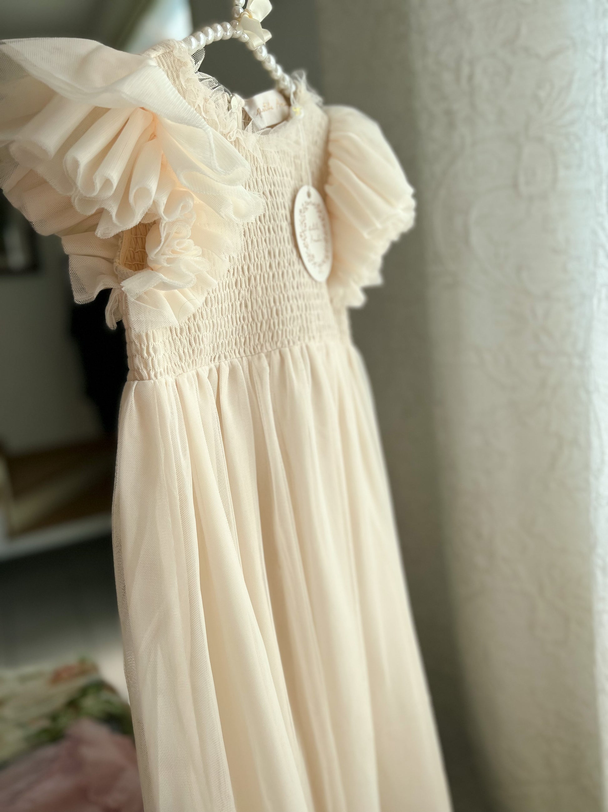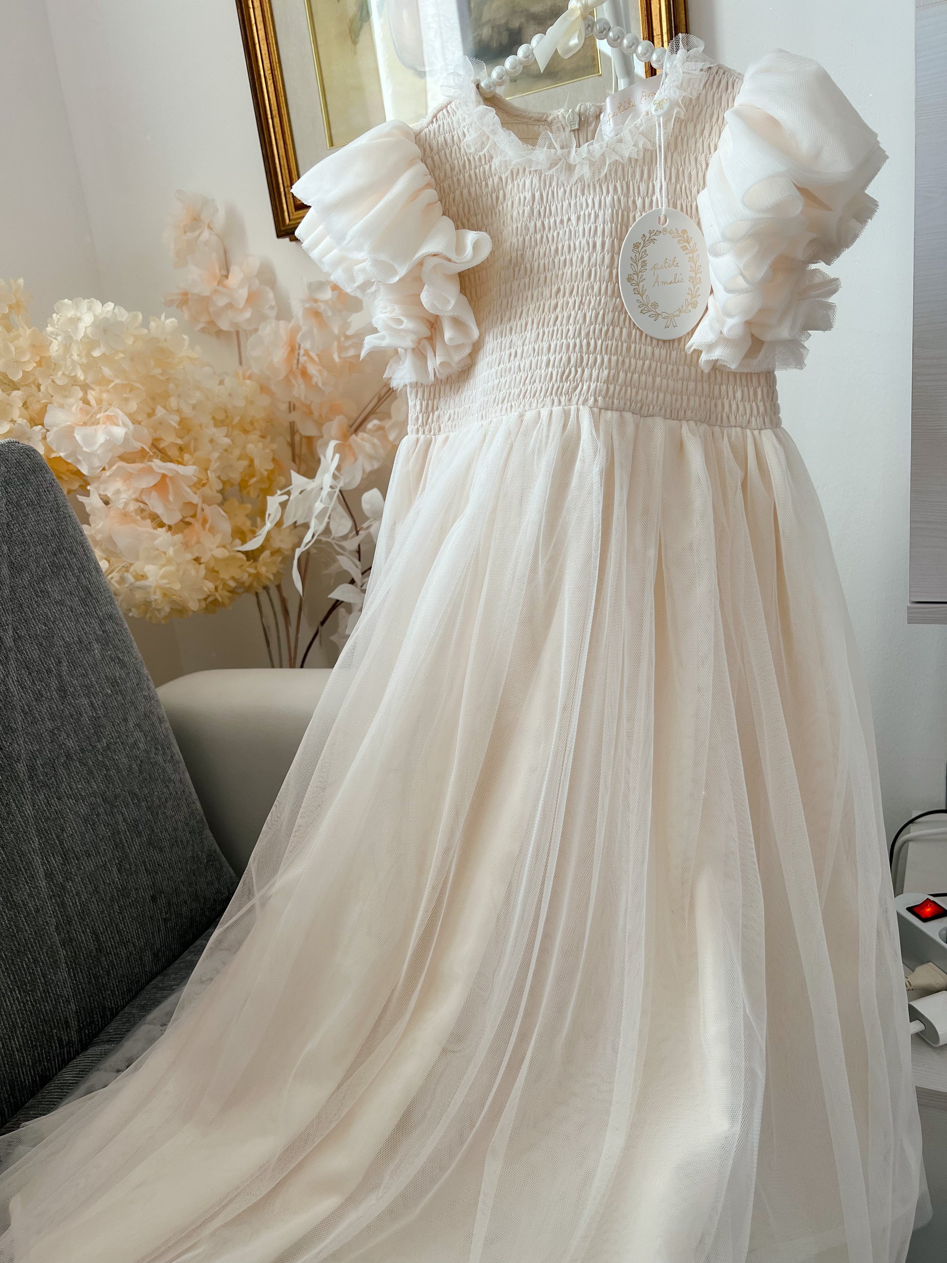 Fustan i gjate me extra gjatesi prej tyli te bute, ngjyre pana