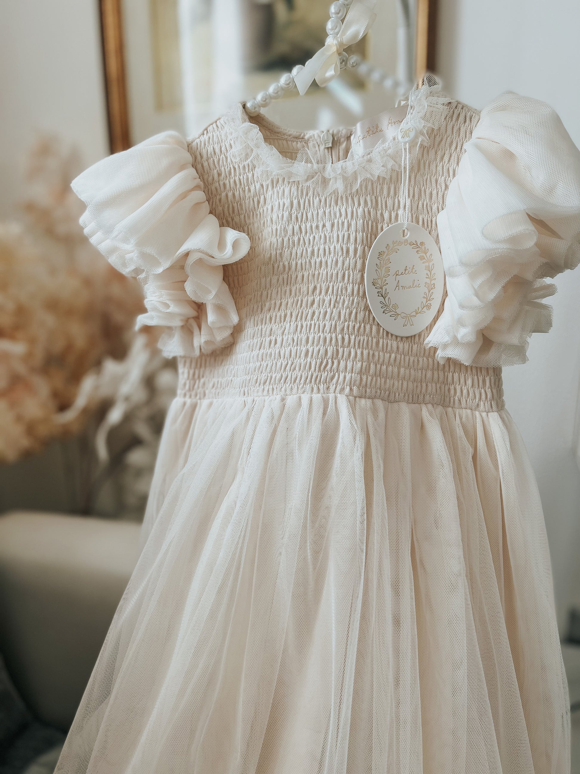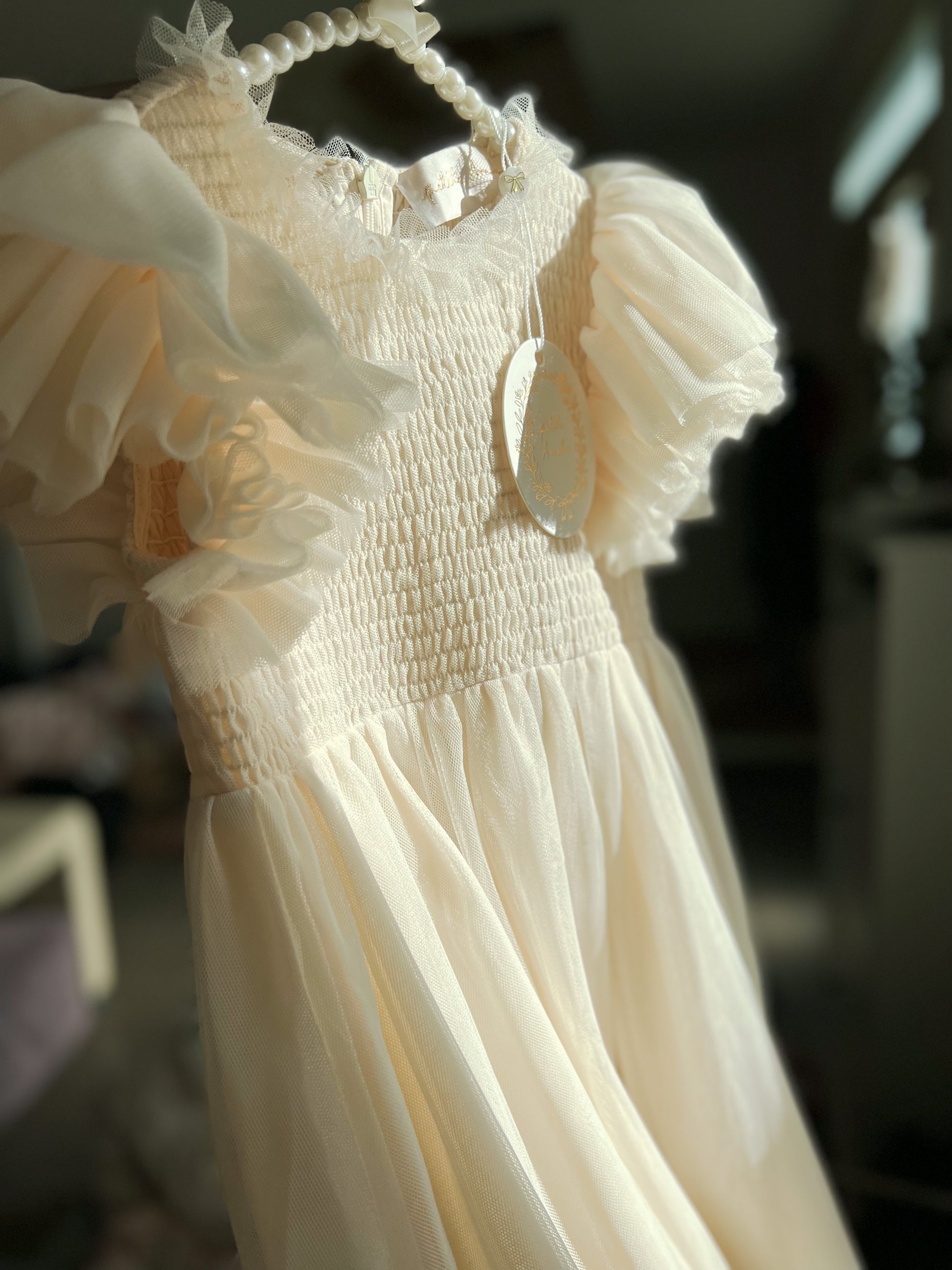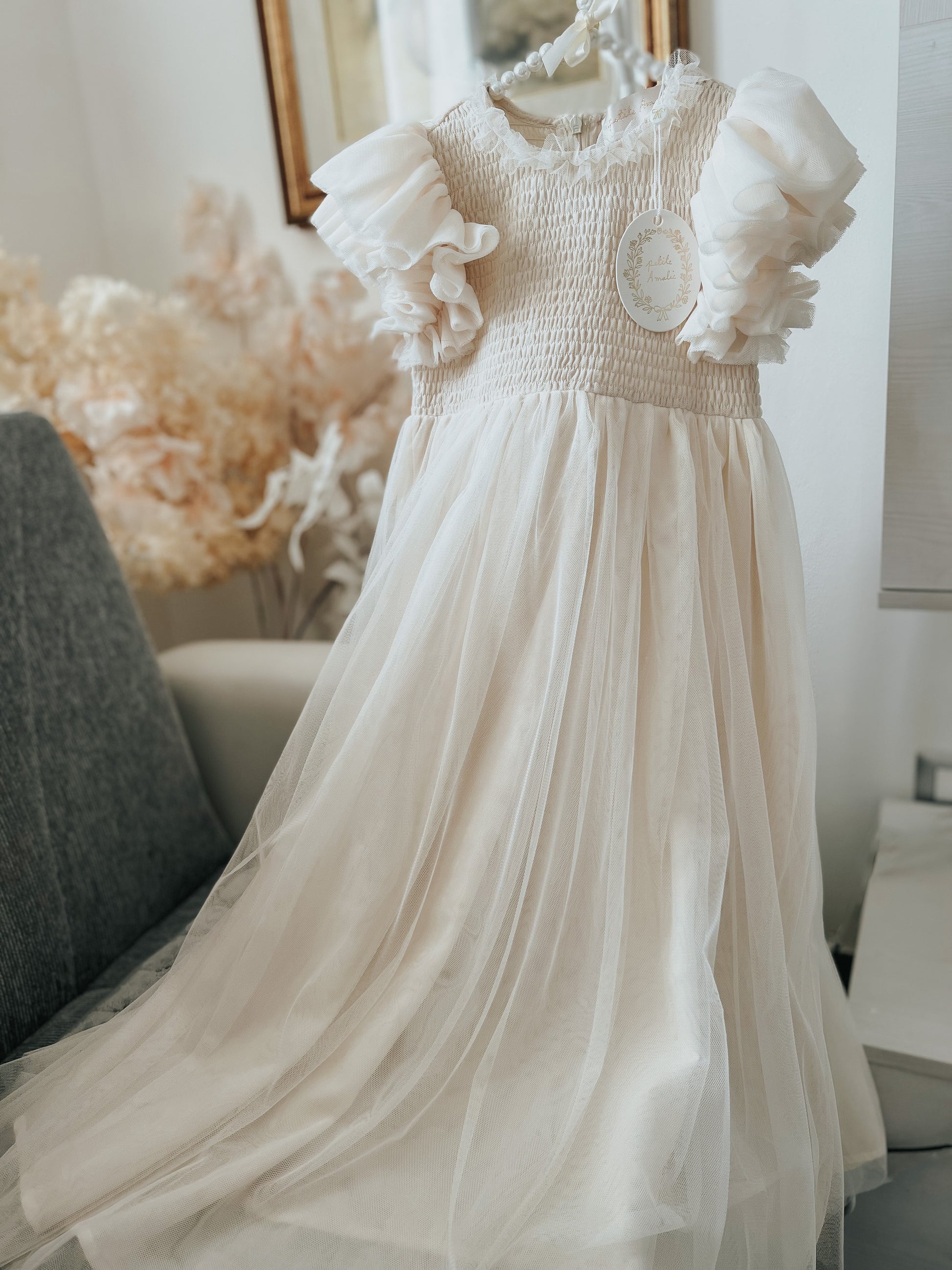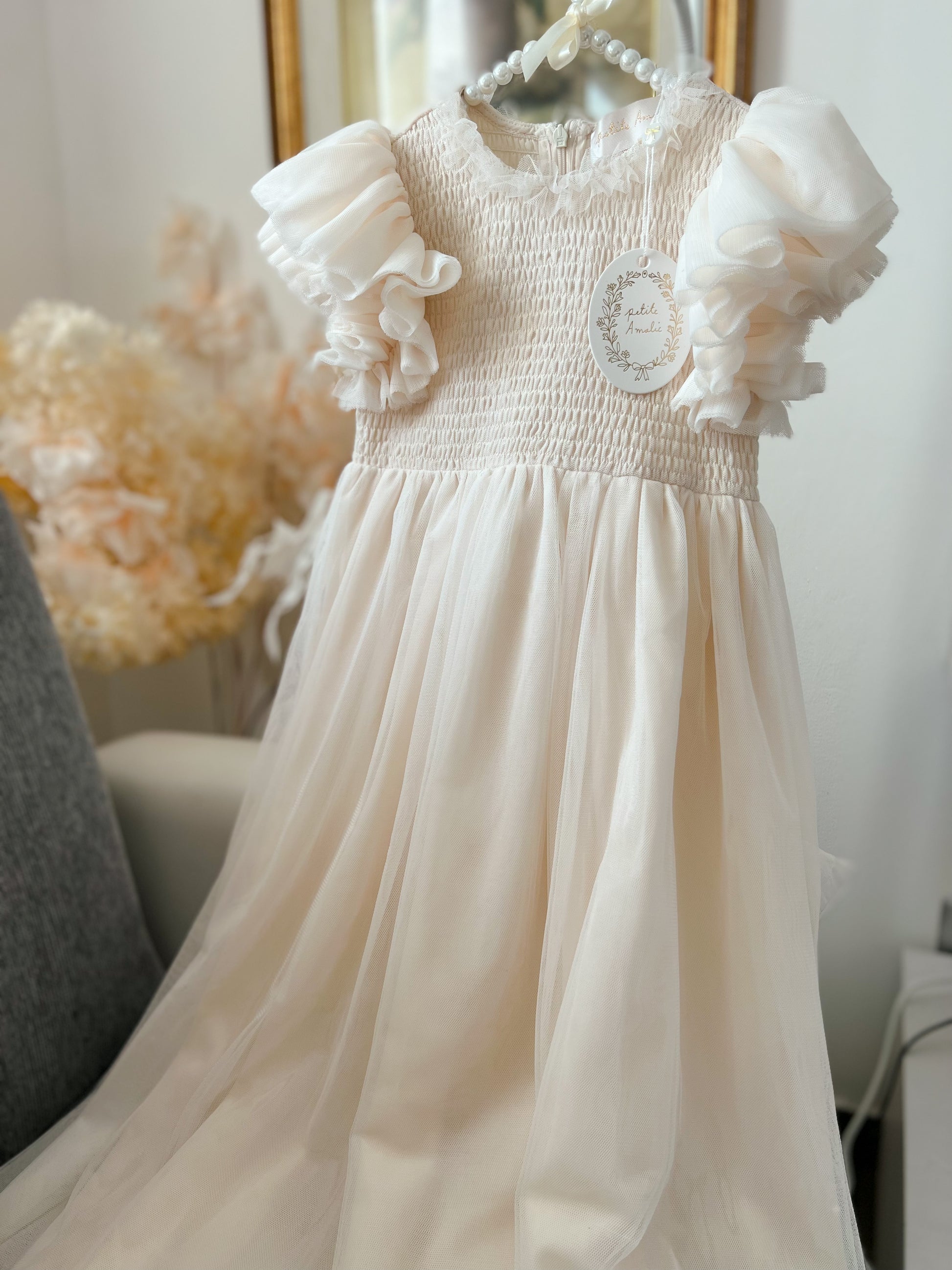 Fustan i gjate me extra gjatesi prej tyli te bute, ngjyre pana