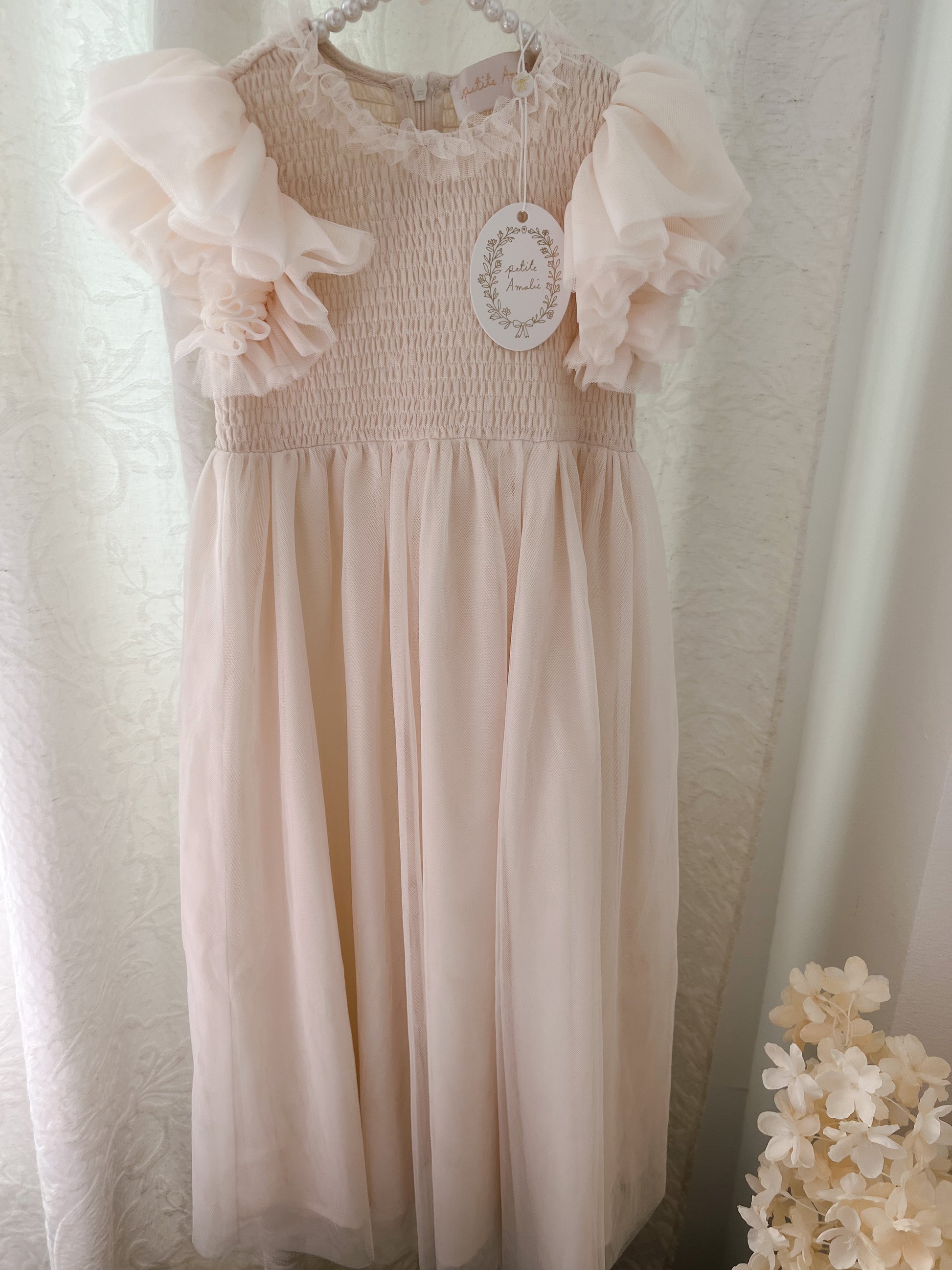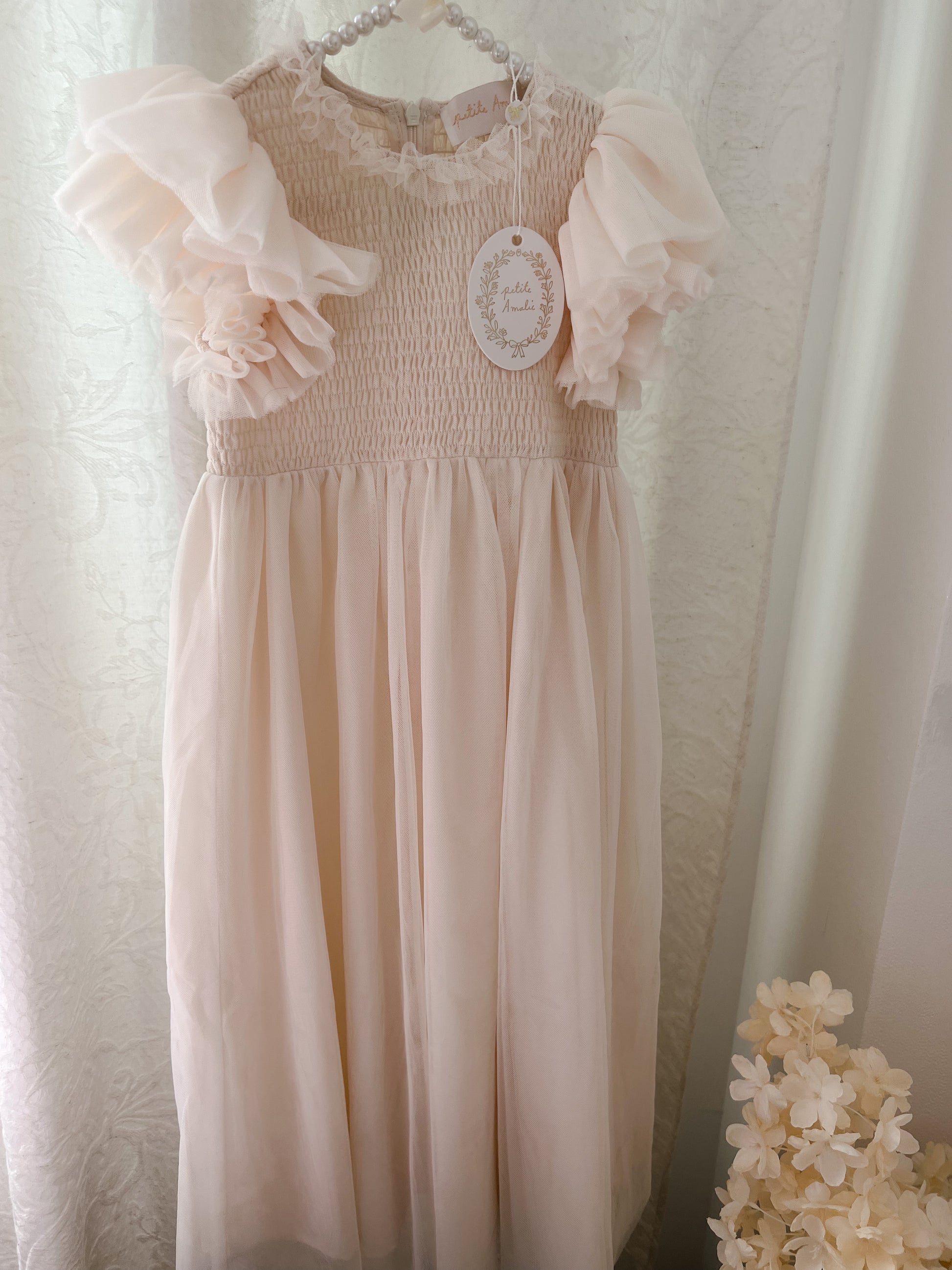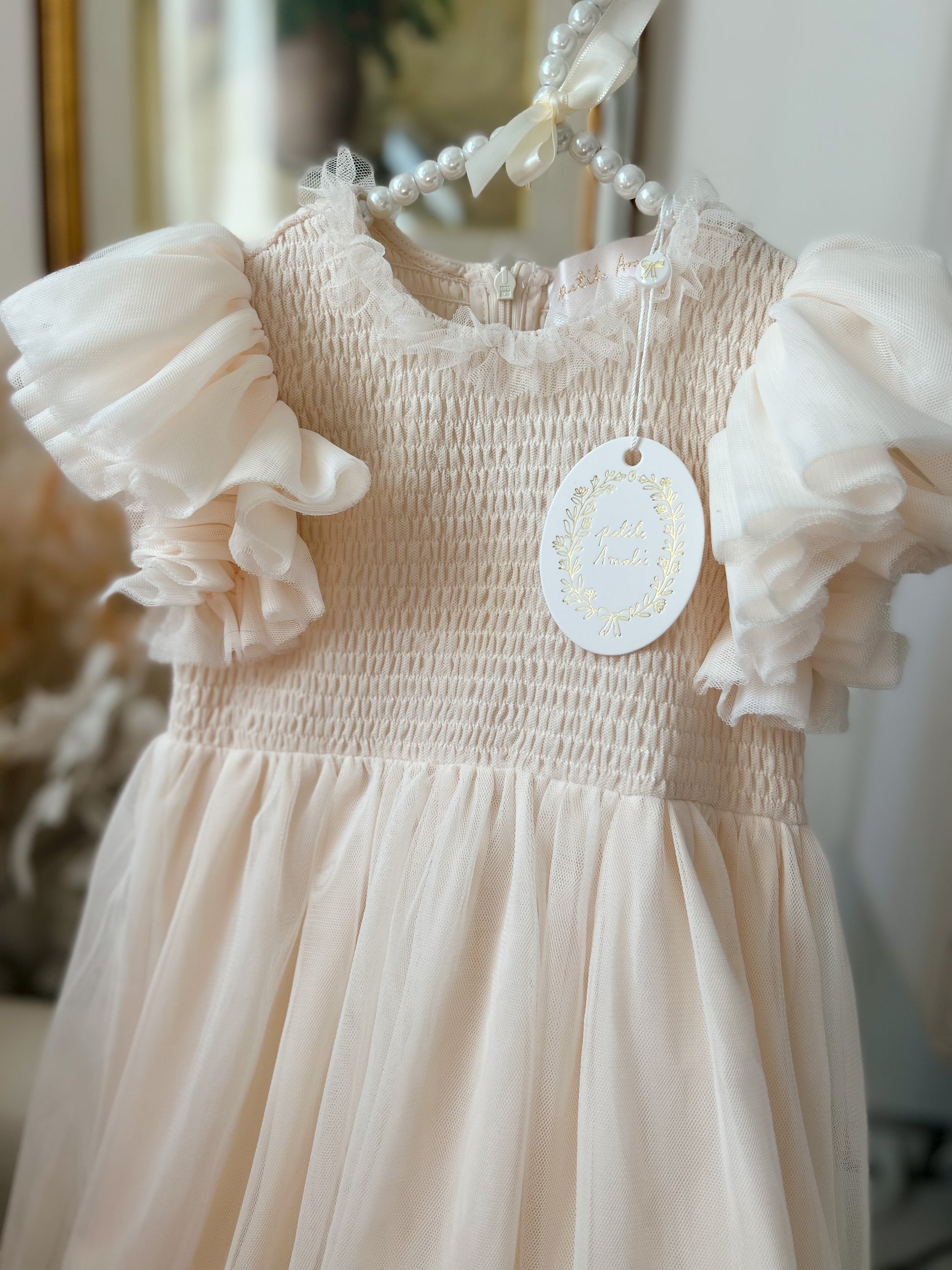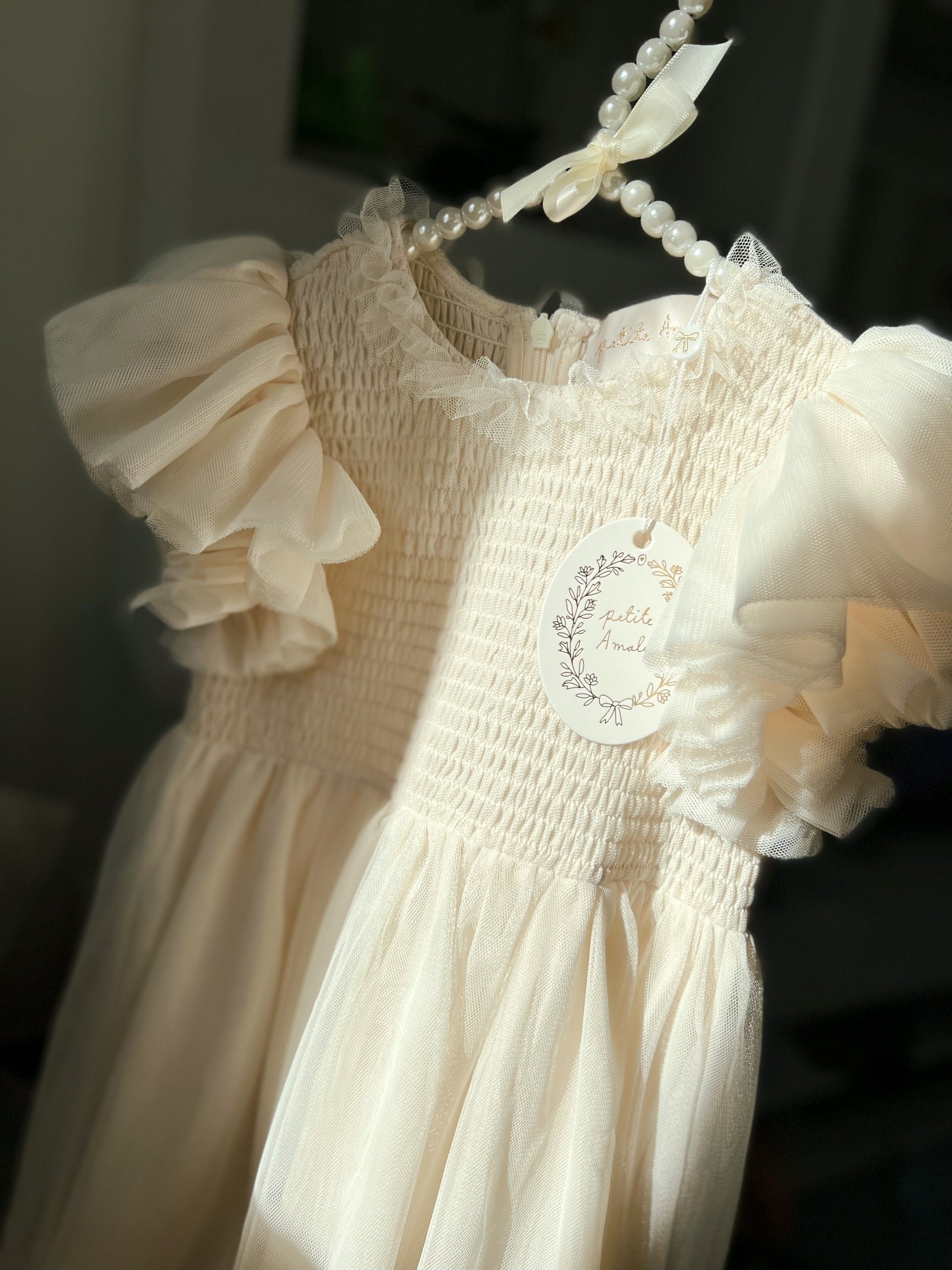 Fustan i gjate me extra gjatesi prej tyli te bute, ngjyre pana