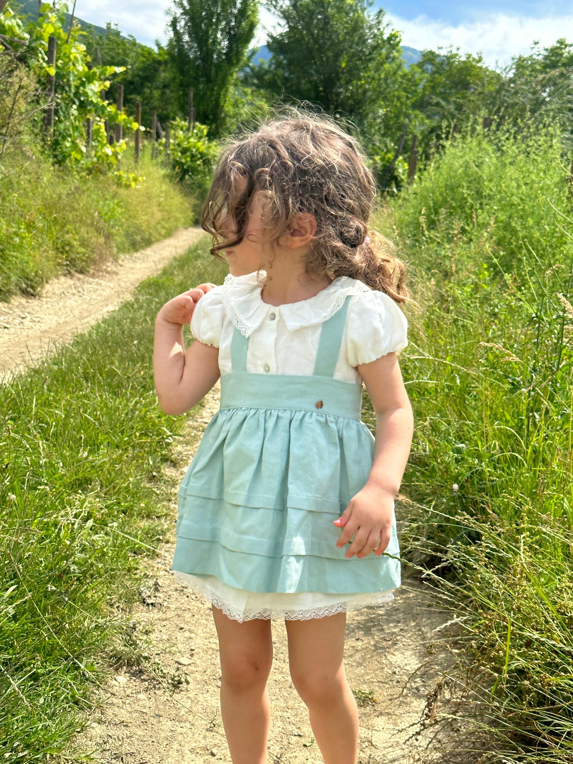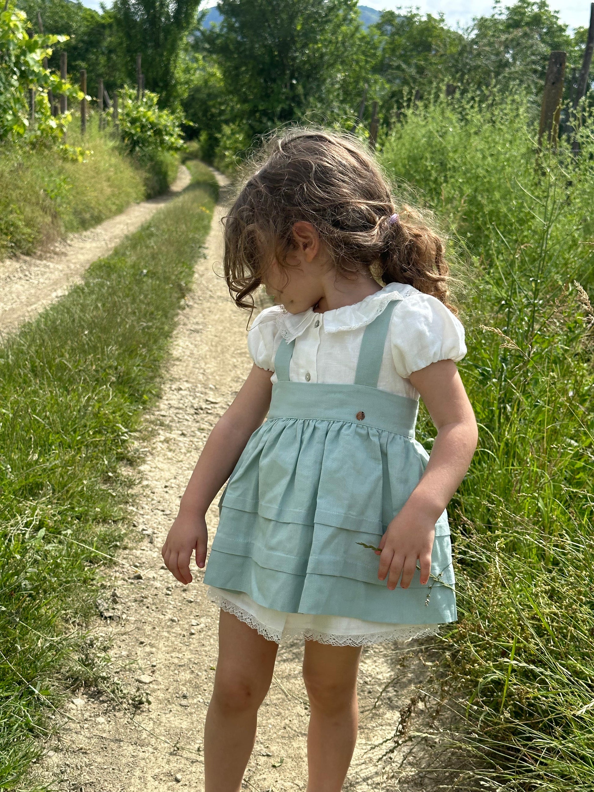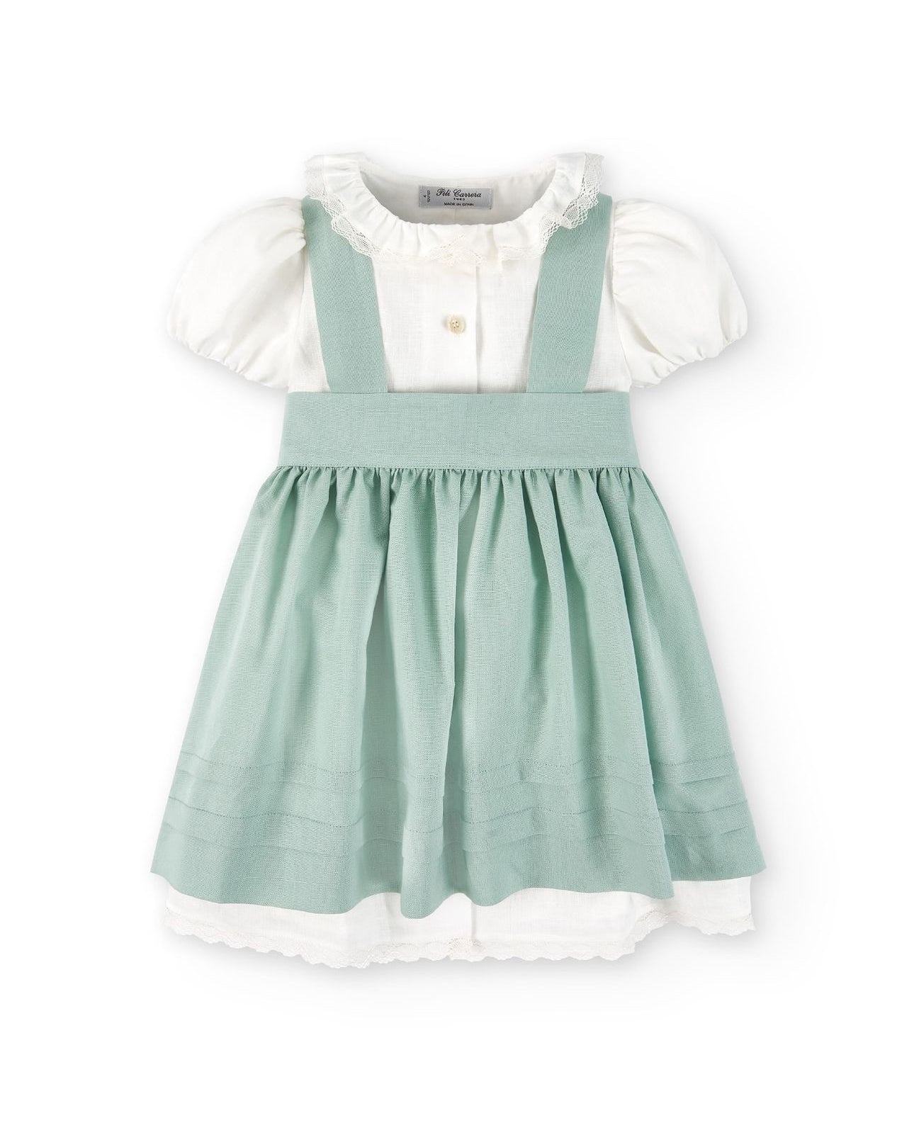 Fustan lino me 2 pjese, fustan i bardhe dhe perparese e siperme jeshile lino! Vishen dhe veç secila