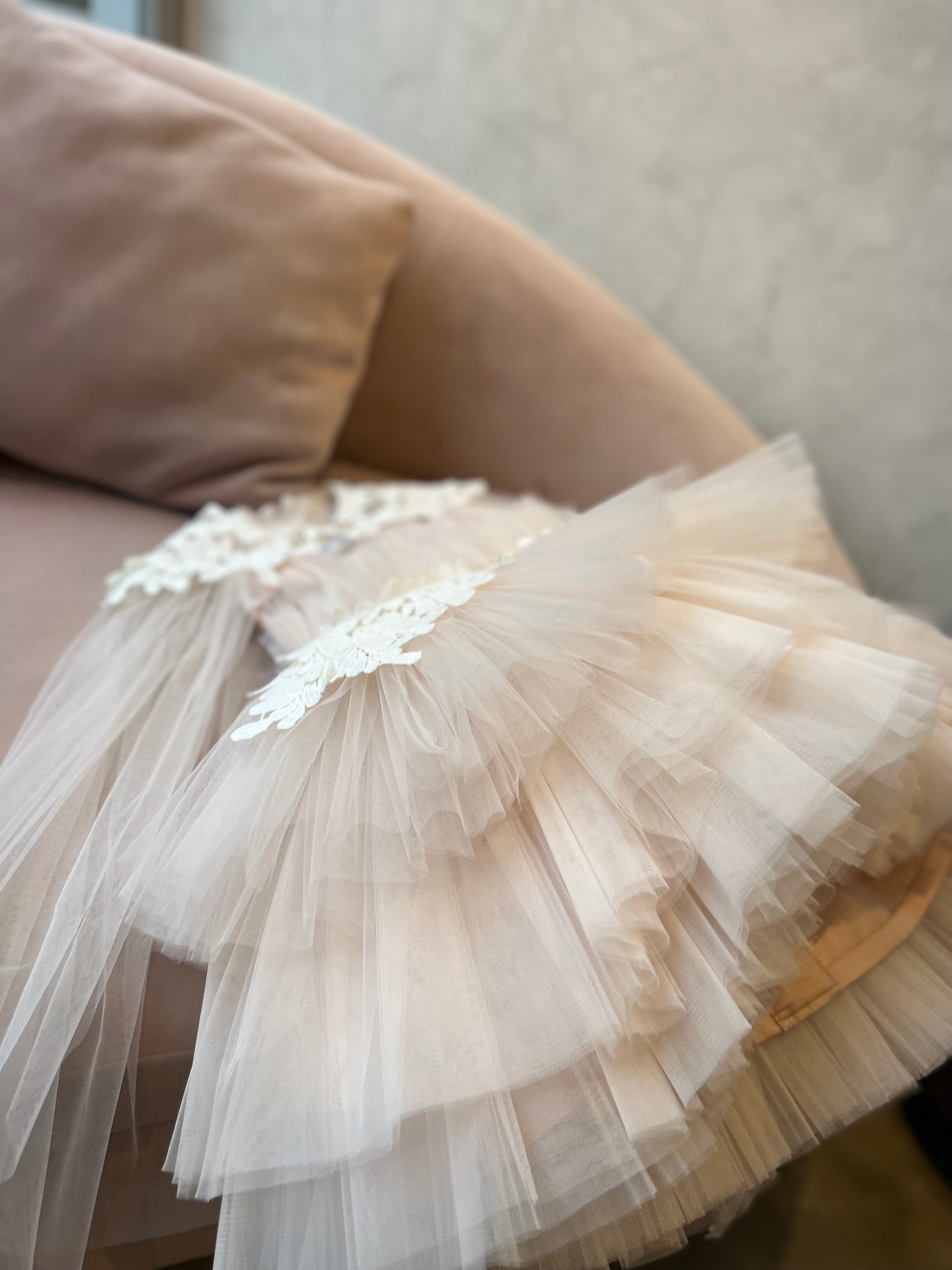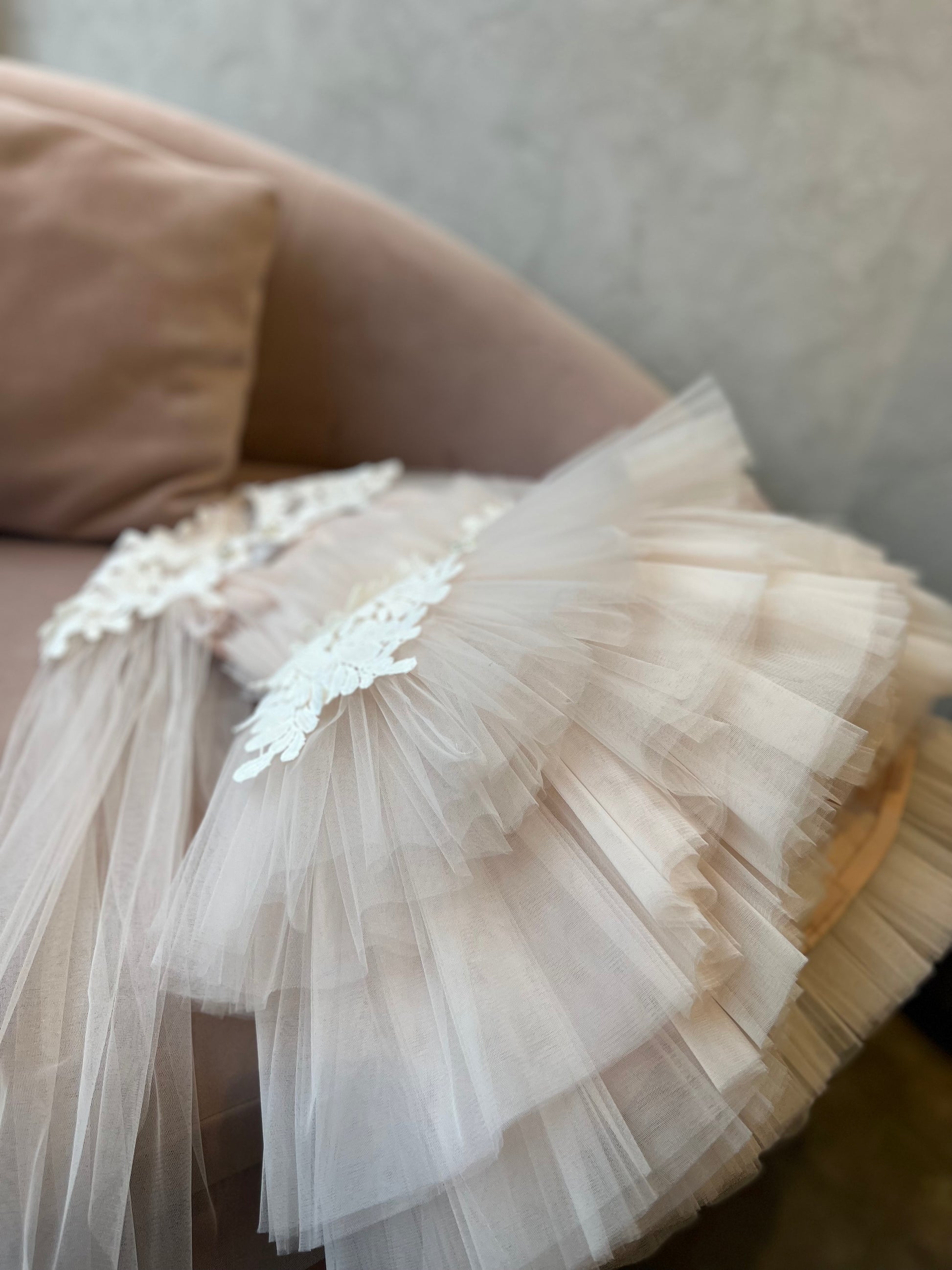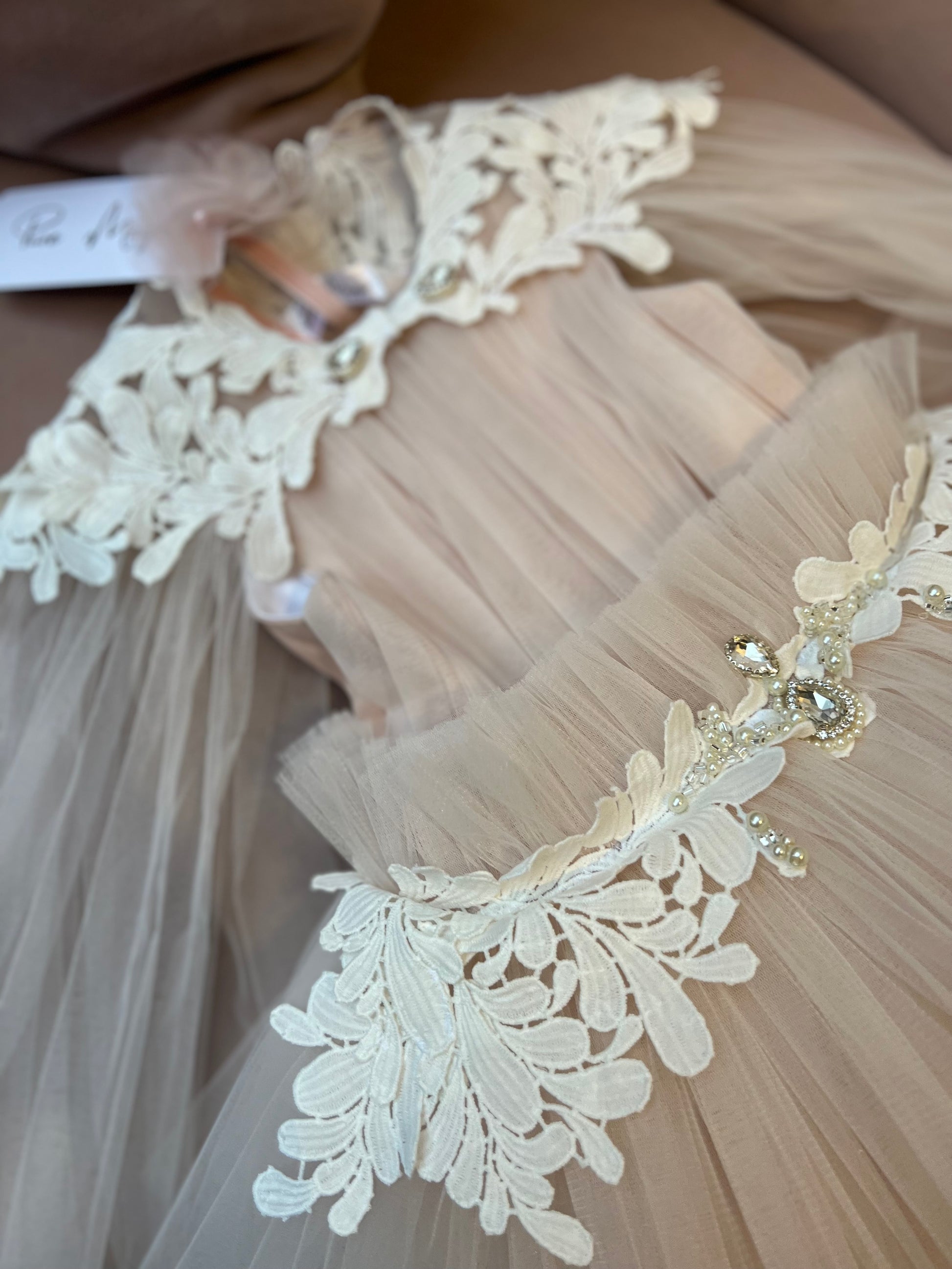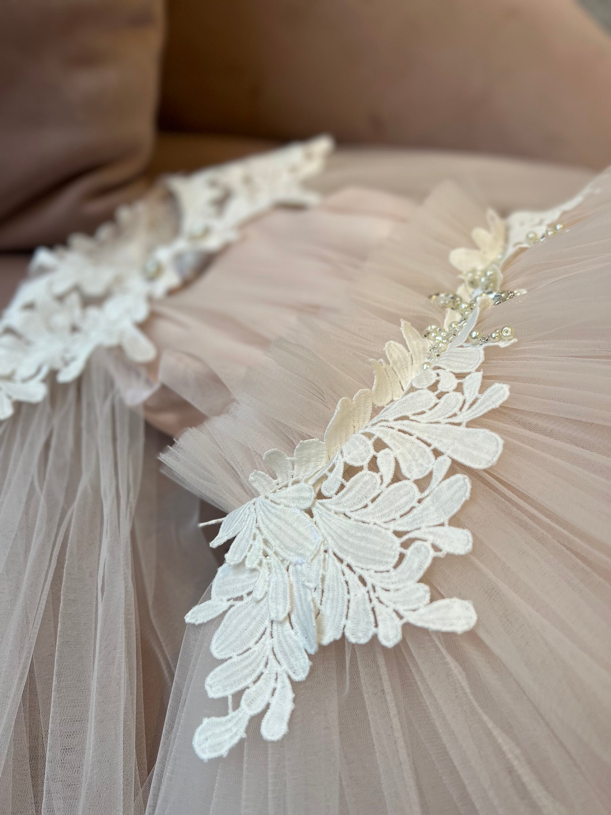 Ky fustan balerine krijon një siluetë me shtresa prej tyli delikate.Përfundon me një rrip tyli, të zbukuruar me dantellë franceze dhe kristale rrezatuese, i cili qëndron bukur në bel.Pelerina është prej tyli delikate, e zbukuruar me dantellë franceze dhe kristale vintage, duke i shtuar një prekje të sofistikuar dhe ëndërrimtare.