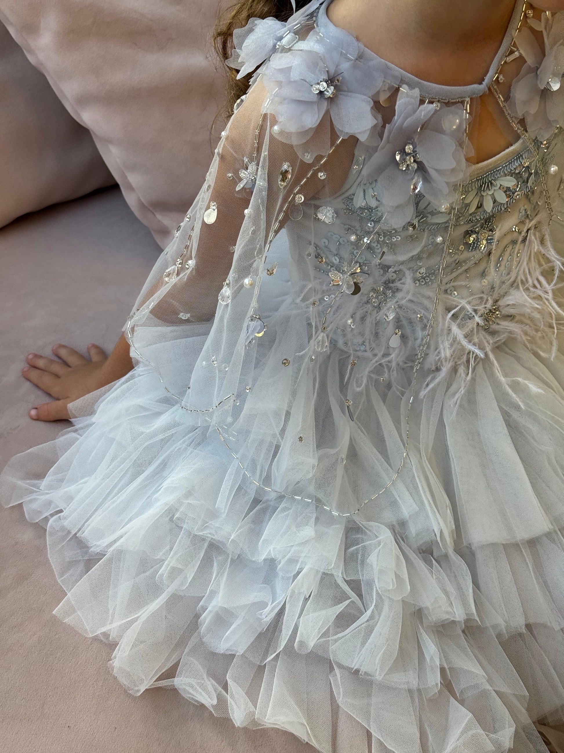 Feathered Garden Tutu Dress.Fustan eventesh pambuk me detaje te qendisura, pupla, shtresa tyli dhe gure.